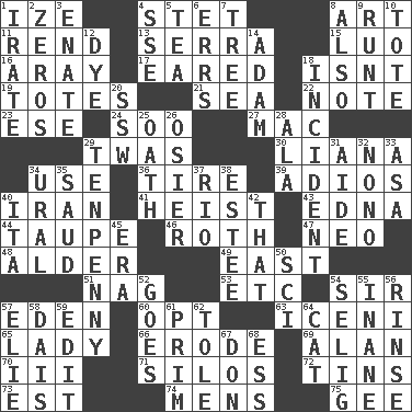 ACROSS 1. Ending with capital 4. Proofreading order 8. Nonscientific branch of learning 11. Tear apart 13. Father Junipero _ 15. Nilotic language 16. Like ___ of sunshine 17. Having ears or earlike features 18. Is not 19. Hauls 21. Ocean 22. Observe 23. Compass dir. 24. "Barney Miller" actor Jack 27. Big _ 29. It was, poetically 30. Climbing, woody, usually tropical vines 34. Purpose 36. Become fatigued 39. Goodbye (Sp.) 40. SW Asia republic 41. Robbery 43. Pulitzer Prize-winning author Ferber 44. Grayish beige 46. Writer of Portnoy's Complaint (1969) 47. Modern: prefix 48. Tree or shrub in the Birch family 49. 90 degrees 51. Tired old horse 53. And so on (abbr.) 54. Title for a knight 57. Locale of original sin 60. Choose 63. Ancient Celtic tribe of eastern Britain 65. Kenny Rogers chart-topper in '80 66. Wear away 69. ____ Jay Lerner 70. One more than two 71. Grain storage towers 72. Metal containers 73. Eastern Standard Time (abbr.) 74. Not women's 75. Turn to the right DOWN 1. Feeling or showing extreme anger 2. Nothings 3. Maternal 4. Compass dir. 5. Beverage made from leaves 6. Blunders 7. Family _ (genealogy) 8. In addition 9. The smallest animal of a litter 10. Lug 12. Color 14. First of billions? 18. Happening 20. Compass dir. 25. Pledge 26. Flexible twig of a willow tree 28. Wing 29. 3-inch nail 31. Assistant 32. Words to Nanette 33. White ___ sheet 34. Mountain range 35. Saudi Arabian king (1953-1964) 37. River (Sp.) 38. First name in cosmetics 40. Call ___ day 42. Not this but _ 45. Epoch 50. _-fi 52. Leaves 54. Former Milwaukee Brewers owner Bud 55. Empty; void 56. Remove soap 57. Writer Wiesel 58. Raised platform 59. Prepare for publication 61. Demure 62. Lacquered or enameled metalware 64. Feline 67. Spanish title 68. Double-curved letter