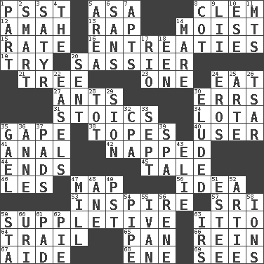 ACROSS 1. Inconspicuous attention getter 5. White ___ sheet 8. Clement's nick name 12. Wet nurse 13. Hit sharply and swiftly 14. Wet 15. Assign a rank or rating to 16. Pleas 19. Attempt to accomplish something 20. More impudent 21. Family _ (genealogy) 23. Single 24. Erode 27. Pismires 30. Blunders 31. Unemotional ones 34. Globular water bottle used in Asia 35. Stare wonderingly 38. Drinks excessively 40. One who makes use of a thing 41. Of or related to the anus 42. Slept 44. Extremities 45. Falsehood 46. French article 47. Atlas unit 50. It may be bright or harebrained 53. Heighten or intensify 57. _ Lanka 59. Supplementary 63. "Tell ____ the Marines!" 64. Get behind 65. Baking dish 66. It's straight from the horse's mouth 67. Assistant 68. Compass dir. 69. Observes DOWN 1. Piece 2. Don Adams' spy role 3. Man with strong sexual desires 4. Definite Article 5. Type of rug 6. Without 7. Flats, for short 8. Small bed 9. Cards in a Roman deck? 10. Compass dir. 11. Mountains (abbr.) 14. Female horse 17. River (Sp.) 18. Car or cant ending 20. Transmitted 22. Artist's stands 24. Greek god of love 25. Johnson of "Laugh-In" 26. Russian ruler of old 28. Small child 29. The Jewish people; Israel 30. Dodged 32. Numbers guy (abbr.) 33. Back-to-school mo. 35. Highlander 36. Queen of England 1702-14 37. Writing tablets 39. Health resort 43. Writer Wiesel 47. Place where flour is made 48. One (Scot) 49. Pacific Standard Time (abbr.) 51. First name in cosmetics 52. Nick name for Arthur 54. Corncob 55. "Terrible" tsar 56. French philosopher Descartes 58. Charged atoms 59. R.R. building 60. RI univ. 61. Groovy apt. 62. Sliced dessert 63. Big collection agency
