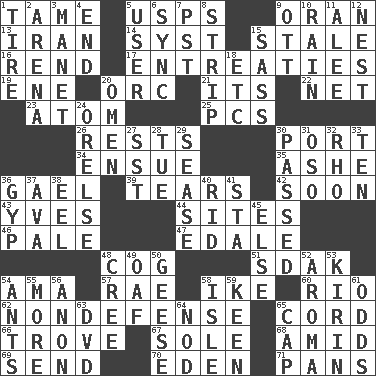 ACROSS 1. Not wild 5. United States Postal Service (abbr.) 9. Northwest Algerian city 13. SW Asia republic 14. System (abbr.) 15. Lacking originality or spontaneity 16. Tear apart 17. Pleas 19. Compass dir. 20. The grampus (Milton) 21. ___ a Wonderful Life 22. Remaining after all deductions 23. Smallest unit of an element 25. Personal Computers (abbr.) 26. Musical pauses 30. Left side of a ship or aircraft 34. Follow as a consequence or result 35. American tennis player Robert 36. Highlander 39. Pulls apart 42. Within a short period 43. Jacques Cousteau's middle name 44. Settings 46. Diluted with white 47. Peak District village in England 48. Gear tooth 51. Neighbor of Neb. 54. Housemaid (var.) 57. Actress Charlotte 58. Mamie's mate 60. _ de Janeiro 62. Unrelated to defense, as in spending 65. Drawstring 66. Collection of objects 67. Flatfish 68. Among 69. Transmit 70. Paradise 71. Zero-star reviews DOWN 1. Become fatigued 2. Sports stadium 3. French painter Edouard 4. Conclude 5. One who uses or employs something 6. Synchronize (abbr.) 7. Pacific Standard Time (abbr.) 8. Long narrow piece of something 9. Baseball player Mel 10. Precipitation 11. Toward shelter 12. Egg locale 15. Backtalk 18. And so on (abbr.) 20. Sign of something about to happen 24. Threatening words 27. Fast jet (abbr.) 28. Third day of the wk. 29. Gospel singer Marvin 30. Went by 31. Bear (Spanish) 32. 17th letter of the Greek alphabet 33. "___ Little Indians" 36. Con 37. Actress Gardner 38. Snakelike fish 40. To free from 41. R.R. building 45. Otherwise 48. Algonquian 49. Clumsy lout 50. Honkers 52. Scent 53. Japanese brewing company 54. Pismires 55. Greater amount 56. Soon (poet.) 58. Capri or Wight 59. Peachy ____! 61. Likelihood 63. Movie disc 64. Allow head to fall sleepily 65. Head covering