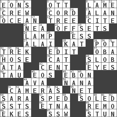 ACROSS 1. Immeasurably long periods of time 5. Baseball player Mel 8. Unable to walk 12. Group working together 13. Drawstring 15. Actor Alda or Thicke 16. Sea 18. Family _ (genealogy) 19. Quote 20. Teachers' org. 22. Cancels 24. Desk light 26. Double-curved letter 27. Jai ____ 28. Krazy ___ of comics 29. Cooking vessel 32. Long journey 35. Prepare for publication 37. Chief or king in Benin or Nigeria 38. Stockings 39. Feline 40. Oscar Madison type 41. _ moment's notice (2 wds.) 42. Penny 43. Snake ____ (dice throw) 44. The 19th letter of the Greek alphabet 45. Greek goddess of the dawn 46. Inky black, to poets 49. Actress Gardner 50. Grandmother 51. Devices for capturing images 55. Remaining after all deductions 56. "Two Mules for Sister ____" 57. Broke a traffic law 59. Having a sole or soles 63. Fast planes 64. Inactive volcano in Sicily 65. San ____ (Riviera town) 66. Supplements with great effort 67. Compass dir. 68. Make senseless or dizzy DOWN 1. Environmental prefix 2. The grampus (Milton) 3. Born 4. Tchaikovsky ballet 5. Sep. follower 6. "Corrida" creature 7. Not kosher 8. Shoestrings 9. Set down 10. Floor protectors 11. Compass dir. 14. Outscore 17. Anneal 21. Wet nurse (var.) 23. Fast jet (abbr.) 25. Parts 28. Baby cat 29. Much (prefix) 30. Mitch Miller's instrument 31. Bar bills 32. Not this but _ 33. Roll call or roster of names 34. He sold his birthright 36. Daniel's nick name 40. Elected representatives 42. Rough 45. First lady 47. Prohibit 48. Singles 49. Collect or gather 51. Keg 52. Johnson of "Laugh-In" 53. Flats, for short 54. Elected reps. 56. Compass dir. 58. Fool 60. Allow 61. Australian flightless bird 62. Spanish title