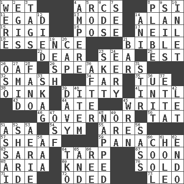 ACROSS 1. Dripping 4. Curves 8. 23rd letter of the Greek alphabet 11. Mild oath 13. Method 14. ____ Jay Lerner 15. Swiss mountan, "Queen of the Mountains" 16. Airs 17. Famous astronaut Armstrong 18. Center 21. Instruction Manual for Humans 22. Letter starter 23. Ocean 25. Eastern Standard Time (abbr.) 26. Clumsy lout 29. Orators 32. Box-office sellout 34. At a great distance 35. Third day of the wk. 38. Pig sound 39. Short, simple song 41. International (abbr.) 43. ___ good deed 44. Had dinner 45. Compose 46. Head of state? 50. Make lace 51. White ___ sheet 54. Symbol (abbr.) 55. Ancient Greek god of war 57. Bundle of cut stalks of grain 59. Flamboyance 63. "Two Mules for Sister ____" 64. Canvas cover 67. Within a short period 68. Roberta Peters solo 69. Leg joint 70. Exchanged or delivered for money 71. Binary compound 72. Wrote a lyric poem 73. Lion DOWN 1. Past tense of be (plural) 2. Armor plate that protects the chest 3. Labels 4. Electrical Unit 5. Friend of Pooh 6. Music discs 7. Observe 8. Cadet 9. Travels by water 10. An arm off of a larger body of water 12. Passed on 14. Black tropical American cuckoo 19. Delicate 20. Head covering 21. Oblong piece of solid material 23. Three-handed card game 24. Suggestive of the supernatural 26. Bear (Spanish) 27. Among 28. Papal veil 30. Following 31. Commotion 33. Heroin 36. A single undivided whole 37. Singer James 39. _ Jones' Locker 40. A distinct part 42. Allow 45. Songbird 47. Order of Saint Francis (abbr.) 48. Slept 49. Mouth or opening 51. Slender Brazilian palm 52. Pottery fragment 53. Nest on high 56. Backtalk 58. Auto club (abbr.) 60. Calm and collected 61. Opening into or through something 62. Inside; within (prefix) 64. Ring climax 65. Plus 66. To separate or throw off