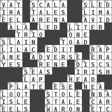 ACROSS 1. Large container 4. Any of the three canals of the cochlea 9. Downhill vehicle 13. Retirement account (abbr.) 14. Stories 15. Pale green bean 16. Snakelike fish 17. Sports stadium 18. Enthusiastic 19. In the manner of 21. Directed 22. 61 cubic inches 24. Musical group of three 26. Single 27. Killed 29. Frog relative 30. Pale purple color 31. Prepare for publication 33. Reproach for some lapse or misdeed 36. One (Scot) 37. Contrary to your interests or welfare 40. Period 41. Consenting reply 42. French philosopher Descartes 43. Flat circles 45. Oceans 47. From or relating to Ireland 48. Pet locale 49. Froth on beer 50. Food holder 52. Compass dir. 54. Teachers' org. 56. Plunder 57. Fur scarf 59. Basketball assoc. 61. Capri or Wight 62. Showing deterioration from age 63. Auto 64. Snakelike fish 65. Make _____ (do battle with) 66. And so on (abbr.) DOWN 1. Compete 2. Type of rug 3. Baron Munchausen's specialties 4. R.R. building 5. Monte _, Las Vegas Hotel/Casino 6. Toward shelter 7. Grant temporary use of 8. White ___ sheet 9. Scheduled 10. Moving, as bait 11. Arab leader 12. Male parent 20. Roberta Peters solo 22. Plunders 23. _ tizzy (2 wds.) 25. South American Indian 27. Kill 28. Actor's bit 29. Hoop that covers a wheel 31. Nights before holidays 32. Lair 33. Home 34. Arches 35. Romantic infatuation 38. Window treatment 39. Singer Brickell 44. SW Asia republic 45. Chalkboards 46. Erode 49. Phone greeting 50. Airs 51. Hang loosely or laxly 52. Singer James 53. Fly high 55. Blind as ____ 56. Whopper 57. Compass dir. 58. Car or cant ending 60. Curve