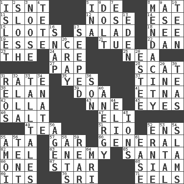 ACROSS 1. Is not 5. Binary compound 8. Floor covering 11. A type of plum 12. Sense of smell 14. Compass dir. 15. Plunders 17. Vegetable dish 18. Born 19. Center 21. Third day of the wk. 22. One of the 12 tribes of Israel 23. Definite Article 24. "We ___ not amused" (Victoria) 25. Teachers' org. 27. Infant food 28. Jazz singing style 31. Assign a rank or rating to 35. It is so 37. Prong on a fork 38. Flair 39. ___ good deed 41. Inactive volcano in Sicily 42. Rounded earthenware pot or jar 43. Compass dir. 45. Sight organs 46. Table seasoning 47. Connecticut Ivy Leaguer 49. Afternoon social gathering 51. _ de Janeiro 52. Followers of ems 55. _ moment's notice (2 wds.) 57. Slender fish 60. Commissioned military rank 62. Cartoonist voice _ Blanc 63. Foe 65. Before Barbara or Clara 66. Single 67. Play the lead 68. Thailand, formerly 69. ___ a Wonderful Life 70. Indian title of respect (Mr.) 71. Snakelike fish DOWN 1. Small island 2. Splash clumsily 3. Trap for birds or small mammals 4. False hair 5. _ tizzy (2 wds.) 6. Dunce 7. He sold his birthright 8. Ananias' fault 9. At sea 10. Adolescent 13. Paradise 16. Fastener 17. Oozed 20. Supercomputer manufacturer 26. First name in cosmetics 29. Singer Murray 30. Afternoon social gatherings 31. Vintage cars 32. Silent film actress Nazimova 33. Baron Munchausen's specialties 34. Related on the mother's side 36. Manchild 40. Disorder of the immune system 44. Writer Wiesel 48. Charged particles 50. Ripens 52. Bert's buddy 53. Brizilian seaport 54. Shuts with force 55. Mine, in Marseilles 56. Portable shelter 58. Pismires 59. Bring up, as a child 61. Comfort 64. Medical imaging device (abbr.)