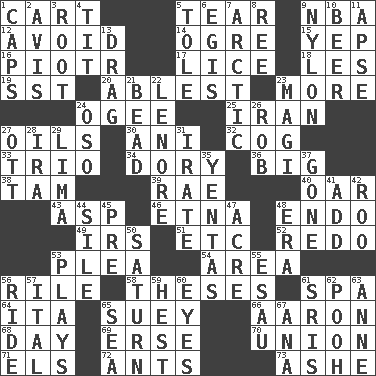 ACROSS 1. Haul 5. Pull apart 9. Basketball assoc. 12. Prevent from happening 14. Legendary monster 15. Slangy assent 16. Peter (Polish) 17. Louse (plural) 18. French article 19. Fast jet (abbr.) 20. Most capable 23. Greater amount 24. Double curve, resembling the letter S 25. SW Asia republic 27. Lubricates 30. Black tropical American cuckoo 32. Gear tooth 33. Musical group of three 34. Rowboat 36. Large 38. Scottish cap 39. Actress Charlotte 40. Rowing implement 43. Cleo's killer 46. Inactive volcano in Sicily 48. Inside; within (prefix) 49. Big collection agency 51. And so on (abbr.) 52. Make new 53. Entreaty 54. Type of rug 56. Cause heat under the collar 58. College papers 61. Health resort 64. Call ___ day 65. Chop _ 66. Composer Copland 68. 24 hours 69. Celtic language 70. The state of being joined or united 71. Raised railways 72. Pismires 73. American tennis player Robert DOWN 1. Balmoral and tarboosh 2. Advice 3. Carrot, for example 4. Teat (slang) 5. Lacquered or enameled metalware 6. The front part of a cuirass 7. Northern region 8. Portuguese money of account (variant) 9. High-strength synthetic material 10. Fermented drink made from hops 11. Domed church section 13. To be drawn or hauled along 21. Necklace unit 22. Poe poem 23. Wise men 24. Bear (Spanish) 26. Director Reiner 27. Baseball player Mel 28. Retirement account (abbr.) 29. Pale green bean 31. Feeling or showing extreme anger 35. Gossips 37. Went 41. Find the sum of 42. Friend of Pooh 44. Drop; flow; fall 45. Before (prefix) 47. 43,560 square feet 48. Period 50. Titan orbits this 53. Frolics 55. Son of Isaac 56. Travel on an animal 57. Slanted text style (abbr.) 59. Behest 60. Snake ____ (dice throw) 61. Indian titles of respect 62. "Silly old bear" 63. Singer Murray 65. Ocean 67. Santa ___, CA