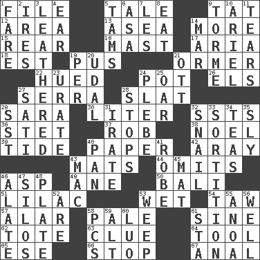 ACROSS 1. Do some clerical work 5. Lie 9. Make lace 12. Type of rug 13. At sea 14. Greater amount 15. Bring up, as a child 16. Vertical spar for supporting sails 17. Operatic vocal solo 18. Eastern Standard Time (abbr.) 19. Fluid product of inflammation 21. Channel Islands abalone 22. Became colored 24. Cooking vessel 26. Raised railways 27. Father Junipero _ 28. Narrow board 29. "Two Mules for Sister ____" 30. 61 cubic inches 32. Fast planes 36. Proofreading order 37. Director Reiner 38. Christmas carol 39. Event that recurs at intervals 40. Some stationery 42. Like ___ of sunshine 43. Floor coverings 44. Leaves out 46. Viper 49. A saturated hydrocarbon 50. Indonesian resort city 51. Pale purple color 53. Dripping 54. The 23rd letter of the Hebrew alphabet 57. Having or resembling wings 58. Light colored 61. Trig term 62. Carry 63. A slight indication 64. Implement 65. Compass dir. 66. Cease 67. Of or related to the anus DOWN 1. Conductor's collection 2. Angers 3. Resembling or made to resemble leather 4. Ewer handle 5. Scottish caps 6. White ___ sheet 7. French article 8. Erode 9. Singer Mel 10. Satellite of Uranus 11. Separates forcefully 14. Spoil 19. For each 20. Allodial 21. Baseball player Mel 23. A salt of uric acid 24. Cadet 25. Rowing implement 27. Suttee (variant) 28. Discontinues 29. Fast jet (abbr.) 31. Feeling or showing extreme anger 32. Slow-paced one 33. Making a chance decision by using lots 34. Afternoon social gatherings 35. Wily 40. Baking dish 41. Loose flowing garment 43. Apple computer (short form) 45. Floor protector 46. Having winglike extensions 47. Grain storage towers 48. Food holder 52. "We ___ not amused" (Victoria) 53. Shed a tear 55. Small Philippine buffalo 56. Water source 58. Personal Computers (abbr.) 59. The first octave above the treble staff 60. Nilotic language 61. R.R. building