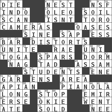ACROSS 1. Pass on 4. A home for chicks 8. Overdraft (abbr.) 11. _ china 13. Butter sub 14. The visible part of the earth's surface 15. Glance over 16. Is not 17. "Corrida" creature 18. Devices for capturing images 21. Fertile tracts in a desert 22. Trig term 23. Plant excrement 25. Double-curved letter 26. Soap unit 29. What propaganda does 32. Join together 34. Actress Charlotte 35. University (slang) 38. Ancient Roman robe 39. Practice fights 41. Dormintory (informal) 43. Tired old horse 44. Small amount or degree 45. Indian state 46. SAT takers 50. Compass dir. 51. Slender fish 54. Followers of ems 55. Length times width 57. Bee-related 59. Player piano 63. Protracted 64. Cease 67. Arab leader 68. Celtic language 69. Migrant worker of the '30s 70. Gone 71. Had dinner 72. Disposed of to a purchaser 73. Born DOWN 1. Plate 2. South American Indian 3. Dutch treat 4. Annoying sounds 5. Raised railways 6. Elected rep. 7. Small child 8. Trap for birds or small mammals 9. Founders of families 10. Soft thread for cleaning between teeth 12. Singles 14. R.R. building 19. Travel on or in a vehicle 20. Cuckoo 21. Choose 23. Fly high 24. Ancient Greek god of war 26. Yet 27. Soon (poet.) 28. Capital of Latvia 30. Barter 31. Soap bubbles 33. Labels 36. Sense of smell 37. SW Asia republic 39. Astound 40. Writing tablets 42. Madame (abbr.) 45. Toward the sea 47. "___ Little Indians" 48. Slept 49. Three (prefix) 51. An organ shaped like a helmet 52. To the left, to Queeg 53. Remove soap 56. Afresh 58. Personal question 60. Sign of something about to happen 61. Actor's bit 62. Johnson of "Laugh-In" 64. Distress signal 65. Ring climax 66. Petroleum