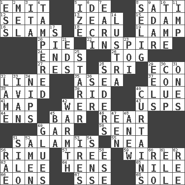 ACROSS 1. Send forth 5. Binary compound 8. Suttee (variant) 12. Bristle 13. Ardor 15. Dutch treat 16. Criticizes harshly 18. Shade of tan 19. Desk light 20. Sliced dessert 22. Motivate 24. Extremities 26. Coat; cloak 27. Take ten 28. Indian title of respect (Mr.) 29. Environmental prefix 32. Actor's bit 35. At sea 37. A really long time 38. Enthusiastic 39. To free from 40. A slight indication 41. Atlas unit 42. We are 43. United States Postal Service (abbr.) 44. Followers of ems 45. Oblong piece of solid material 46. Hitchcock's "____ Window" 49. Slender fish 50. Transmitted 51. Deli grouping 55. Teachers' org. 56. Tall New Zealand timber tree 57. Family _ (genealogy) 59. One who wires 63. Toward shelter 64. Coop moms 65. "Death on the ____" 66. Immeasurably long periods of time 67. Compass dir. 68. Flatfish DOWN 1. Double-curved letter 2. Cartoonist voice _ Blanc 3. Call ___ day 4. ________ with (broke a safety seal) 5. Ending with capital 6. Tenth: prefix 7. Merit 8. Major League Baseball Commissioner Bud 9. The sixth month of the Jewish calendar 10. Docile 11. Mischievous child 14. A period of five years 17. Trig term 21. Begley and Asner 23. Luau course 25. A viewer who gazes fixedly 28. Spring feasts 29. Snakelike fish 30. Clever action or accomplishment 31. Washington bills 32. Unable to walk 33. "Terrible" tsar 34. Pinches, bites 36. Title for a knight 40. Window treatments 42. Heat 45. Sound made by sheep 47. Car or cant ending 48. Afresh 49. Cements 51. Grain storage tower 52. So be it 53. Angers 54. Elected reps. 56. Actress Charlotte 58. Compass dir. 60. River (Sp.) 61. Pipe bend 62. To sift