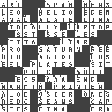 ACROSS 1. Nonscientific branch of learning 4. Connect, as a bridge 8. Possessive pronoun 12. Lion 13. Sun: prefix 14. Locale of original sin 15. Of or related to the anus 17. Having winglike extensions 18. Pale green bean 19. Under perfect conditions 21. Portable computer 23. Fast jet (abbr.) 24. Compass dir. 26. French article 27. Singer James 28. One who doesn't tell the truth 30. Adept person 31. Titan orbits this 34. To sift 37. River (Sp.) 38. Remain 39. Begley and Asner 40. Snakelike fish 41. Food holders 42. Be seated 43. College mil. group 44. Costume for a special activity 46. Greek goddess of the dawn 47. Auto club (abbr.) 50. Conclude 51. Heat 54. Hard copy producer 57. Medicinal plant 58. Flexible twig of a willow tree 60. Singles 62. Do over again 63. Seines 64. Head covering 65. Observes 66. Inactive volcano in Sicily 67. Period DOWN 1. Wing 2. Painter Guido (1575-1642) 3. Inedible or poisonous agaric 4. Exchanges for money 5. Frolics 6. Small island 7. Christmas carol 8. Aide 9. Proofreads 10. San ____ (Riviera town) 11. Fastener 13. Actor Linden 16. For fear that 20. _ moment's notice (2 wds.) 22. Actor Alda or Thicke 25. Evade 27. 4th largest of the Great Lakes 29. Angers 30. Before (prefix) 31. Table seasoning 32. Phillipine bananalike plant 33. Teat (slang) 34. Home 35. Prepare for publication 36. Eastern Standard Time (abbr.) 41. Mail 43. Lover boys 44. Elected rep. 45. To (old English) 46. Wear away 48. Bee-related 49. Sports stadium 51. Armed conflicts 52. Toward shelter 53. Flexible conduit 55. Big collection agency 56. Bring up, as a child 59. Put into a specified state 61. Health resort