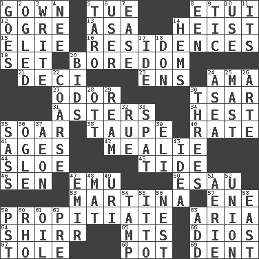 ACROSS 1. Woman's formal wear 5. Third day of the wk. 8. Needle case 12. Legendary monster 13. White ___ sheet 14. Robbery 15. Writer Wiesel 16. Homes 19. Put into a specified state 20. Mood resulting from idleness 21. Tenth: prefix 23. Followers of ems 24. Housemaid (var.) 27. Aroma 30. Russian ruler of old 31. Michaelmas daisies 34. Command 35. Fly high 38. Grayish beige 40. Assign a rank or rating to 41. Matures 42. Ear of corn 44. A type of plum 45. Periodic rise and fall of the sea level 46. Elected rep. 47. Australian flightless bird 50. Son of Isaac 53. Chrissie's court nemesis 57. Compass dir. 59. Appease 63. Operatic vocal solo 64. Bake eggs in their shells 65. Mountains (abbr.) 66. "Vaya con ____" 67. Lacquered or enameled metalware 68. Plant holder 69. Gouge DOWN 1. Travels 2. Stared at amorously 3. Compose 4. Born 5. Edible starchy tuberous root 6. One who makes use of a thing 7. Relaxation 8. Car or cant ending 9. Nervous spasm 10. Purpose 11. ___ a Wonderful Life 14. Folds over and sews together 17. Binary compound 18. Spanish title 20. Auction offers 22. Unrefined 24. Toward the sea 25. Vertical spar for supporting sails 26. Johnson of "Laugh-In" 28. Baseball player Mel 29. 480, 500 or 516 sheets of paper 30. Triplets 32. Sorrow 33. Petty quarrel 35. Backtalk 36. Stare at amorously 37. Period of immesurable duration 39. Connecticut Ivy Leaguer 43. The main thing one is thinking about 47. Arab leader 48. Floor protector 49. RI univ. 51. Nest on high 52. The state of being joined or united 54. Pack (down) 55. "Tell ____ the Marines!" 56. A home for chicks 58. Compass direction 59. Pacific Standard Time (abbr.) 60. 17th letter of the Greek alphabet 61. Petroleum 62. Before (prefix) 63. Increase