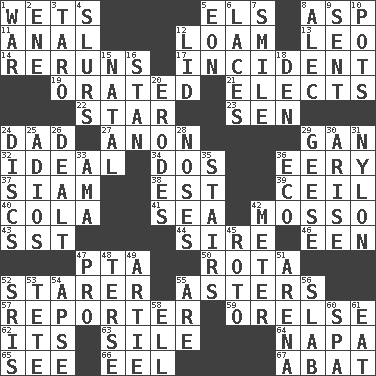 ACROSS 1. Moistens 5. Raised railways 8. Cleo's killer 11. Of or related to the anus 12. Rich soil 13. Lion 14. Summer TV shows 17. Event 19. Declaimed 21. Opts 22. Play the lead 23. Elected rep. 24. Male parent 27. At once, immediately (arch.) 29. Separate the seeds from cotton 32. Standard of perfection 34. Two (Sp.) 36. Suggestive of the supernatural 37. Thailand, formerly 38. Eastern Standard Time (abbr.) 39. To provide with a ceiling 40. Root beer relative 41. Ocean 42. With motion or animation 43. Fast jet (abbr.) 44. Beget 46. Car or cant ending 47. Parent Teacher Assoc. 50. Round or rotation of duties 52. A viewer who gazes fixedly 55. Michaelmas daisies 57. Newsperson 59. Threatening words 62. ___ a Wonderful Life 63. Drop; flow; fall 64. California wine valley 65. Perceive with the eye 66. Snakelike fish 67. Blind as ____ DOWN 1. Armed conflict 2. Compass dir. 3. Pacific island yam 4. Runs notes together 5. A really long time 6. Shoestrings 7. Grin 8. Actor Baldwin 9. Emitted 10. Plant holders 12. Hat (slang) 15. Relating to or accompanying birth 16. Comedian Laurel of Laurel & Hardy 18. Lair 20. Eats (away) 24. Flat circles 25. Goodbye (Sp.) 26. Started a card game 28. Olfactory organs 29. Honkers 30. Ascend 31. High-strength synthetic material 33. Nanny (var.) 35. Flight of steps 36. Environmental prefix 42. Distance measurement 45. Printing process, for short 47. Adept person 48. Laconic 49. Nick name for Arthur 51. Sports stadium 52. Indian titles of respect 53. False hair 54. Domed church section 55. "We ___ not amused" (Victoria) 56. Broad, flat, thick piece 58. Pipe bend 60. Health resort 61. Consume