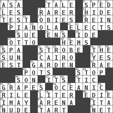 ACROSS 1. White ___ sheet 4. Lie 8. Broke a traffic law 12. French article 13. Less widely known 14. Flintstone garb 15. Trial 17. Off-Broadway awards 18. It's straight from the horse's mouth 19. Player piano 21. Opts 23. Take to court 24. Followers of ems 26. Binary compound 27. Von Bismarck 28. Cloth borders 30. Health resort 31. Disco prop 34. Definite Article 37. Player for Phoenix 38. Capital of Egypt 39. It is so 40. Eastern Standard Time (abbr.) 41. Place where plants grow 42. Actress Charlotte 43. Cooking vessels 44. Close up, plug up 46. Male child 47. It is 50. Nervous spasm 51. Wine fruits 54. Pertaining to the sea 57. Cause heat under the collar 58. 61 cubic inches 60. Singer Brickell 62. "If ____ say so..." 63. Sports stadium 64. Call ___ day 65. Naked 66. Small pie 67. Remaining after all deductions DOWN 1. The first octave above the treble staff 2. Ooze 3. Helper 4. Eating place 5. Believer in; advocate of (suffix) 6. Area sheltered from the wind 7. Celtic language 8. Fragments 9. Part 10. Prepare for publication 11. Cub Scout units 13. Friend of Pooh 16. Strained 20. Modern: prefix 22. Citrus frut 25. Dinah or Pauly 27. Musical composition 29. Inky black, to poets 30. Compass dir. 31. Go away! 32. Tarsus (plural) 33. To free from 34. Polypeptide antibiotic 35. Pile 36. Compass dir. 41. Went 43. Wimpy's pal 44. R.R. building 45. Prong on a fork 46. First course 48. Carrier 49. Aroma 51. Broad smile 52. Tall New Zealand timber tree 53. Narrow board 55. Epoch 56. Quote 59. Lyricist Gershwin 61. Consume