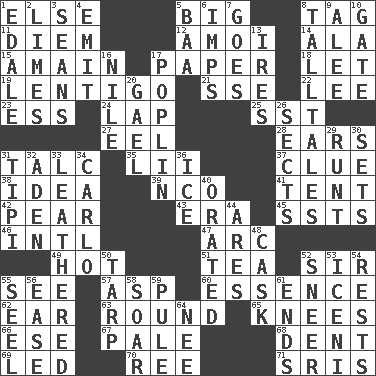 ACROSS 1. Otherwise 5. Large 8. Label 11. South Vietnam president (1954) 12. Mine, in Marseilles 14. In the manner of 15. With great haste 17. Some stationery 18. Allow 19. Small, flat, pigmented spot on the skin 21. Compass dir. 22. Area sheltered from the wind 23. Curvy letter 24. Infant locale 25. Fast jet (abbr.) 27. Snakelike fish 28. Hearing organs 31. Baby powder 35. Cards in a Roman deck? 37. A slight indication 38. The main thing one is thinking about 39. Non-commissioned officer (abbr.) 41. Portable shelter 42. Lightbulb-shaped fruit 43. Period 45. Fast planes 46. International (abbr.) 47. Curve 49. Being at a high temperature 51. Afternoon social gathering 52. Title for a knight 55. Perceive with the eye 57. Cleo's killer 60. Substance 62. Hearing organ 63. Single shot of ammunition 65. Leg joints 66. Compass dir. 67. Diluted with white 68. Undesirable depression on a surface 69. Directed 70. To separate or throw off 71. Indian titles of respect DOWN 1. Peak District village in England 2. Citrus fruits 3. Seines 4. Send forth 5. Sound made by sheep 6. Naughty children 7. Leaves 8. Baron Munchausen's specialties 9. Toward shelter 10. Yard entry 13. Angers 16. The longest river in the world 17. Cotton for raincoats, e.g. 20. Highlander 26. Religious groups 29. The smallest animal of a litter 30. Arranges properly for use 31. Native american tent (variation) 32. An important port of Yemen 33. Resembling or made to resemble leather 34. Monte _, Las Vegas Hotel/Casino 36. Frozen water 40. Spoke pompously 44. Ancient Greek god of war 48. Keg 50. Canvas cover 52. Scornful expression 53. Ancient Celtic tribe of eastern Britain 54. Musical pauses 55. Stitch closed the eyes of (a falcon) 56. Comfort 58. Fly high 59. Whimper 61. Extremities 64. Born