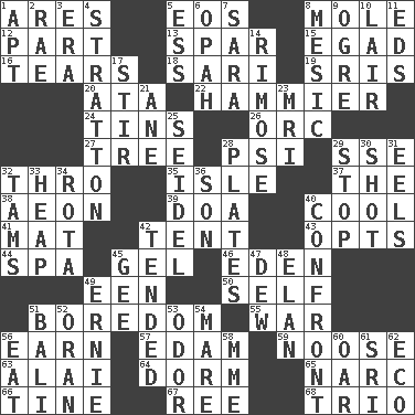 ACROSS 1. Ancient Greek god of war 5. Greek goddess of the dawn 8. Undercover agent 12. Component 13. Practice fight 15. Mild oath 16. Lacerates 18. Indian skirt 19. Indian titles of respect 20. _ moment's notice (2 wds.) 22. More given to overacting 24. Airtight sealed metal containers 26. The grampus (Milton) 27. Family _ (genealogy) 28. Air pressure measure (abbr.) 29. Compass dir. 32. Through, poetically 35. Small island 37. Definite Article 38. Period of immesurable duration 39. ___ good deed 40. Calm and collected 41. Floor protector 42. Portable shelter 43. Chooses 44. Health resort 45. Set 46. Genesis locale 49. Car or cant ending 50. Oneself 51. Mood resulting from idleness 55. Armed conflict 56. Merit 57. Dutch treat 59. Trap for birds or small mammals 63. Jai _ 64. Dormintory (informal) 65. Drug cop 66. Prong on a fork 67. To separate or throw off 68. Musical group of three DOWN 1. Fitting 2. Actress Charlotte 3. Period 4. Ski resort town in Vermont 5. Double-curved letter 6. Brightly colored fish 7. "Two Mules for Sister ____" 8. Mesonic 9. Legendary monster 10. Den 11. Begley and Asner 14. Full of chinks, cracks, or crevices 17. Commotion 21. A saturated hydrocarbon 23. Medical imaging device (abbr.) 25. Beer mug 28. Food holders 29. Obstruct or block passage 30. Attempt 31. Snakelike fish 32. Scottish caps 33. Pile 34. Round or rotation of duties 36. Boy, to dad 40. Meet 42. Looked after 45. Unit of force equal to gravity 47. Morning condensation 48. Enthusiasm 49. Bert's buddy 51. Indonesian resort city 52. Northwest Algerian city 53. Scent 54. Female horse 56. Erode 58. Madame (abbr.) 60. Rowing implement 61. Indian title of respect (Mr.) 62. Environmental prefix