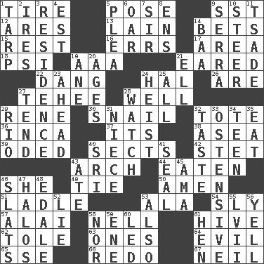 ACROSS 1. Hoop that covers a wheel 5. Introduce or present, as a question 9. Fast jet (abbr.) 12. Ancient Greek god of war 13. (Had) reclined 14. Wagers 15. State of inaction 16. Blunders 17. Length times width 18. 23rd letter of the Greek alphabet 19. Auto club (abbr.) 21. Having ears or earlike features 22. Mild oath, euphamism for damn 24. Actor Linden 26. "We ___ not amused" (Victoria) 27. Giggle 28. Water source 29. French philosopher Descartes 30. Slow-paced one 32. Lug 36. South American Indian 37. ___ a Wonderful Life 38. Toward the sea 39. Wrote a lyric poem 40. Religious groups 42. Proofreading order 43. Bowlike part 44. Consumed 46. A female animal or person 49. Standoff 50. So be it 51. Dipping utensil 53. Wing 54. Playfully artful 57. Jai _ 58. 1994 drama film starring Jodie Foster 61. Hub of activity 62. Lacquered or enameled metalware 63. Washington bills 64. Tending to cause great harm 65. Compass dir. 66. Do over again 67. Famous astronaut Armstrong DOWN 1. Canvas cover 2. Angers 3. Home 4. Eastern Standard Time (abbr.) 5. Entreaty 6. Boat paddle 7. Title for a knight 8. Followers of ems 9. Spanish missionary in California 10. Bull 11. Sadhe (variant) 14. Sound made by sheep 19. A saturated hydrocarbon 20. Grows older 21. Pipe bend 23. Forward in time 24. Robbery 25. 100% 27. Watch over 28. Observe 29. River (Sp.) 31. Sibling's daughter 32. Clothes sense 33. Clearly or manifestly demonstrative 34. Adolescent 35. Consume 40. Indian title of respect (Mr.) 41. Lick closed 43. Had dinner 45. Housemaid (var.) 46. Narrow boards 47. Rings 48. Peak District village in England 52. Whopper 53. In addition 55. 57 in ancient Rome 56. Shout 58. Not either 59. Compass dir. 60. Directed 61. Layer