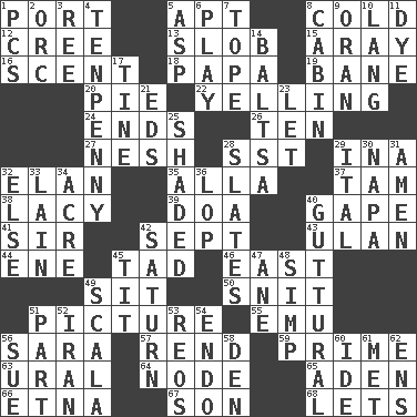 ACROSS 1. Left side of a ship or aircraft 5. Fitting 8. Chilled 12. Algonquian 13. Oscar Madison type 15. Like ___ of sunshine 16. Aroma 18. Dad 19. Object of repulsion 20. Sliced dessert 22. Crying or shouting loudly 24. Conclusions 26. "___ Little Indians" 27. Delicate 28. Fast jet (abbr.) 29. _ tizzy (2 wds.) 32. Style 35. Silent film actress Nazimova 37. Scottish cap 38. Made of lace 39. ___ good deed 40. Open wide 41. Title for a knight 42. Back-to-school mo. 43. ____ Bator 44. Compass dir. 45. Small amount or degree 46. 90 degrees 49. Be seated 50. In a ____ (agitated or irritated) 51. Photo 55. Australian flightless bird 56. "Two Mules for Sister ____" 57. Tear apart 59. A-one 63. Mountain range 64. Connecting point 65. An important port of Yemen 66. Inactive volcano in Sicily 67. Male child 68. Allows DOWN 1. Personal Computers (abbr.) 2. The grampus (Milton) 3. To separate or throw off 4. 3-inch nail 5. Cleo's killer 6. Shaw product 7. Drink excessively 8. Apartment or room in a ship 9. NW Algerian seaport 10. Austrian-born American filmmaker Fritz 11. Color 14. Greek mezzo-soprano Agnes 17. Prong on a fork 21. Begley and Asner 23. Allow 25. Cast a shadow over 28. Chalkboards 29. Slanted text style (abbr.) 30. California wine valley 31. So be it 32. Otherwise 33. (Had) reclined 34. Land measure 36. Trim (branches) 40. From the throat 42. Titan orbits this 45. Teat (slang) 47. A saturated hydrocarbon 48. Simple or foolish person 49. Any of the three canals of the cochlea 51. Component 52. SW Asia republic 53. Vintage cars 54. Inside; within (prefix) 56. Institute legal proceedings 58. Lair 60. Binary compound 61. Was introduced to 62. Followers of ems
