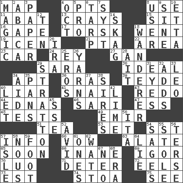 ACROSS 1. Atlas unit 4. Elects 8. Purpose 11. Blind as ____ 13. Trading vessels 15. Be seated 16. Yawn 17. Cod relative 18. Gone 19. Ancient Celtic tribe of eastern Britain 21. Parent Teacher Assoc. 22. Length times width 23. Auto 24. Marina Del _, California 27. Separate the seeds from cotton 29. "Two Mules for Sister ____" 30. Perfect 34. Fitting 36. Mouths or openings 39. Miss Universe 1986, Barbara Palacios _ 40. One who doesn't tell the truth 41. Slow-paced one 43. Do over again 44. Ferber et al. 46. Indian skirt 47. Curvy letter 48. Trials 49. Arab leader 51. Beverage made from leaves 53. Put into a specified state 54. Fast jet (abbr.) 57. Information 60. Solemn pledge 63. Having winglike extensions 65. Within a short period 66. Lacking in sense or substance 69. Russian composer Stravinsky 70. Nilotic language 71. Prevent from occurring 72. Snakelike fish 73. Eastern Standard Time (abbr.) 74. Portico 75. Observe DOWN 1. Mysterious quality of enchantment 2. Phillipine bananalike plant 3. Some stationery 4. Sep. follower 5. Adept person 6. Canvas cover 7. System (abbr.) 8. One who uses or employs something 9. Trig term 10. Singer James 12. Nine, plus one 14. Heroin 18. Roamer 20. Lyricist Gershwin 25. Greek god of love 26. Entertaining tales 28. Small island 29. Ski resort town in Vermont 31. Sight organs 32. Does sums 33. Lion 34. Assistant 35. Baking dishes 37. Auto club (abbr.) 38. Begets 40. Allow 42. Citrus frut 45. Compass dir. 50. Call ___ day 52. Enthusiastic 54. Gurus 55. Fur scarf 56. Laconic 57. Small island 58. Horse sense 59. 12 inches 61. Washington bills 62. Electrical Unit 64. Whopper 67. Modern: prefix 68. Period
