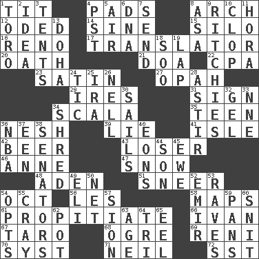 ACROSS 1. Teat (slang) 4. Writing tablets 8. Bowlike part 12. Wrote a lyric poem 14. Trig term 15. Grain storage tower 16. Former U.S. Attorney General Janet 17. Interpreter 20. Pledge 21. ___ good deed 22. Accounting whiz (abbr.) 23. Smooth fabric 27. Brightly colored fish 29. Angers 31. Attach a signature 34. Any of the three canals of the cochlea 35. Adolescent 36. Tender 39. Falsehood 41. Small island 42. Fermented drink made from hops 43. Failure 46. Singer Murray 47. Overwhelm 48. An important port of Yemen 51. Scornful expression 54. Sep. follower 56. French article 58. Atlas contents 61. Appease 66. "Terrible" tsar 67. Pacific island yam 68. Legendary monster 69. Painter Guido (1575-1642) 70. System (abbr.) 71. Famous astronaut Armstrong 72. Fast jet (abbr.) DOWN 1. "Corrida" creature 2. The content of cognition 3. Portable shelters 4. Pacific Standard Time (abbr.) 5. Wind 6. Heredity factor (abbr.) 7. Post 8. White ___ sheet 9. Actors Guy, Robert Welles, and Clint 10. Hoof sound 11. Israeli folk dance 13. Capital of the state of Qatar 18. "Barney Miller" actor Jack 19. Infant locale 24. Nervous spasm 25. Lyricist Gershwin 26. 1994 drama film starring Jodie Foster 28. Having gotten out of bed 30. Moves on water 32. Set 33. Compass dir. 34. Fragment 36. Basketball assoc. 37. Car or cant ending 38. Legislators 40. Immeasurably long periods of time 44. Male child 45. She-sheep 49. Connecticut Ivy Leaguer 50. Fish or hair follower 52. Independent ruler or chieftain 53. All-night dance parties 54. Chooses 55. Supercomputer manufacturer 57. The Jewish people; Israel 59. Baking dishes 60. In a ____ (agitated or irritated) 62. Plant holder 63. Ripen 64. Three (prefix) 65. Snakelike fish