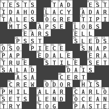 ACROSS 1. Trials 6. Small boy 9. Eastern Standard Time (abbr.) 12. Potato state 13. Made of lace 14. The sixth month of the Jewish calendar 15. Lies 16. Legendary monster 17. Native american tent (variation) 18. Mountains (abbr.) 19. Domed church section 20. Tennis shots 21. Hearing organs 23. Pipe bend 24. Inconspicuous attention getter 25. Bobsleighs 28. Bear (Spanish) 30. Component 34. Fastener 35. Infant food 36. Peak District village in England 38. Period 39. Loyal 41. Vertical member of a panel or frame 43. Put into a specified state 44. Vegetable dish 46. Raised platform 48. White ___ sheet 49. Certainty 50. Group working together 51. Aroma 53. Part of HMS, perhaps 56. Silvers or Donahue 57. Having or resembling wings 58. Monte _, Las Vegas Hotel/Casino 60. Puts into a specified state 61. Grant temporary use of 62. Sea 63. Attempt to accomplish something 64. Coat; cloak 65. Thick mixture DOWN 1. Teat (slang) 2. Dutch treat 3. Table seasoning 4. College papers 5. Distress signal 6. Labels 7. 43,560 square feet 8. Color 9. The property of being fit to eat 10. Plant excrements 11. Three (prefix) 13. Chops off 14. Ringlike coral islands and reefs 19. Nick name for Arthur 20. French article 22. Cleo's killer 24. Teen's desire 26. Have the gumption 27. Argument over a trivial matter 28. Chooses 29. "Two Mules for Sister ____" 31. Begley and Asner 32. Domesticated feline 33. Connecticut Ivy Leaguer 37. A person who is older than you are 40. Artist's stands 42. Hearing organ 45. Fool 47. New York city 49. Drawstring 50. "Mermaids" star 51. Butter sub 52. Mild oath, euphamism for damn 54. Angers 55. Narrow board 56. Pacific Standard Time (abbr.) 57. The first octave above the treble staff 58. Police officer (slang) 59. Single