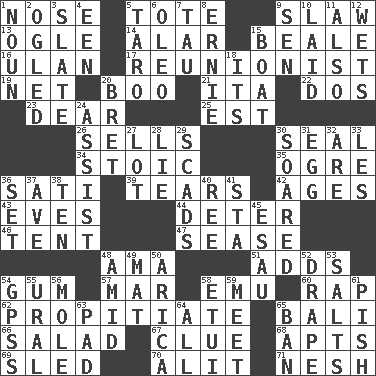 ACROSS 1. Characteristic smell of wine 5. Haul 9. Cole _ (cabbage dish) 13. Stare at amorously 14. Having or resembling wings 15. Calif. Air Force Base 16. Uhlan (variant) 17. One who advocates reunion 19. Fish or hair follower 20. Sometimes accompanies a hiss 21. Call ___ day 22. Two (Sp.) 23. Letter starter 25. Eastern Standard Time (abbr.) 26. Exchanges for money 30. Lick closed 34. Unemotional 35. Legendary monster 36. Suttee (variant) 39. Pulls into pieces 42. Grows older 43. Nights before holidays 44. Prevent from occurring 46. Portable shelter 47. Gospel singer Marvin 48. Nursemaid (var.) 51. Sums up 54. Chewing product 57. Spoil 58. Australian flightless bird 60. Hit sharply and swiftly 62. Appease 65. Indonesian resort city 66. Vegetable dish 67. A slight indication 68. Flats, for short 69. Downhill vehicle 70. Came down and settled, as after flight 71. Delicate DOWN 1. Part of speech 2. Stared at amorously 3. Chalkboard 4. Car or cant ending 5. Pacific island yam 6. Butter sub 7. The 19th letter of the Greek alphabet 8. Bert's buddy 9. Elected rep. 10. Put down 11. In addition 12. Soaks 15. Water vessel 18. ___ a Wonderful Life 20. Cy Young winner Saberhagen 24. Help 27. Car dealer's back yard 28. Falsehood 29. Loads 30. Flew 31. Oval reproductive body of a fowl 32. "We ___ not amused" (Victoria) 33. French article 36. Arrange properly for use 37. "___ Maria" 38. "___ Little Indians" 40. To separate or throw off 41. R.R. building 45. He sold his birthright 48. Among 49. Floor covering 50. N. Chile seaport 52. Window treatment 53. Table seasonings 54. Global Positioning Systems (abbr.) 55. Mountain range 56. Undercover agent 58. Needle holder 59. Confront 61. Expression of disdain 63. Writing tablet 64. 100% 65. Forbid