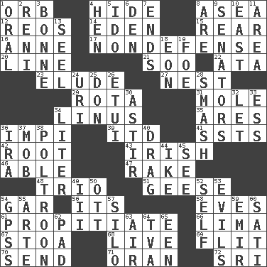 ACROSS 1. Globe 4. Flintstone garb 8. At sea 12. Vintage cars 14. Genesis locale 15. Tail end 16. Singer Murray 17. Unrelated to defense, as in spending 20. Actor's bit 21. "Barney Miller" actor Jack 22. _ moment's notice (2 wds.) 23. Dodge 27. Egg locale 29. Roll call or roster of names 31. Undercover agent 34. "_ and Lucy" (Charlie Brown theme song) 35. Ancient Greek god of war 36. Body of Kaffir warriors 39. It would 41. Fast planes 42. Carrot, for example 43. From or relating to Ireland 46. Competent 47. Immoral or dissolute person 48. Musical group of three 51. Honkers 54. Slender fish 56. It is 58. Nights before holidays 61. Conciliate 66. Pale green bean 67. Portico 68. Not recorded 69. Sudden quick movement 70. Post 71. NW Algerian seaport 72. Indian title of respect (Mr.) DOWN 1. Relating to the mouth 2. Painter Guido (1575-1642) 3. Maid-servant 4. Layer 5. Wedding promise 6. Lair 7. Extremities 8. "We ___ not amused" (Victoria) 9. Elected representatives 10. Compass direction 11. Type of rug 13. Stitch closed the eyes of (a falcon) 18. Period of immesurable duration 19. Enemy 24. RI univ. 25. Spanish title 26. Needle case 28. Box-office sellout 30. Moving or stirring 32. Allow 33. Double-curved letter 34. 61 cubic inches 36. Lyricist Gershwin 37. Crowd into 38. Coward 40. To be drawn or hauled along 44. Mamie's mate 45. Observe 49. One more than two 50. Baseball player Mel 52. Itself 53. Vices 54. Global Positioning Systems (abbr.) 55. Johnson of "Laugh-In" 57. Grain storage tower 59. Arab leader 60. Suttee (variant) 62. Groovy apt. 63. Atmosphere 64. Federal power corp. 65. Car or cant ending