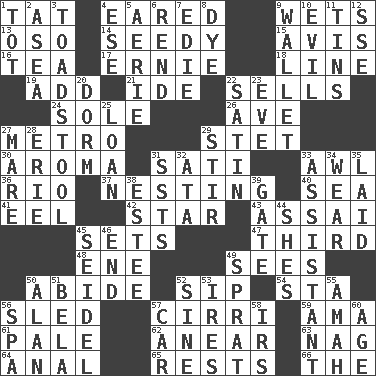 ACROSS 1. Make lace 4. Having ears or earlike features 9. Moistens 13. Bear (Spanish) 14. Sleazy 15. Deliberation 16. Beverage made from leaves 17. Bert's buddy 18. Actor's bit 19. Find the sum of 21. Binary compound 22. Makes a sale 24. Flatfish 26. "___ Maria" 27. Paris' subway 29. Proofreading order 30. Scent 31. Suttee (variant) 33. Leather borer 36. River (Sp.) 37. Nestling 40. Ocean 41. Snakelike fish 42. Play the lead 43. Slender Brazilian palm 45. Puts into a specified state 47. One of three equal parts 48. Compass dir. 49. Perceives with the eye 50. Remain 52. Small drink 54. R.R. building 56. Downhill vehicle 57. High-altitude cloud 59. Wet nurse (var.) 61. Light colored 62. Approach 63. Tired old horse 64. Of or related to the anus 65. Musical pauses 66. Definite Article DOWN 1. Small child 2. At sea 3. Inedible or poisonous agaric 4. Compass dir. 5. Nest on high 6. Tear apart 7. Singer Brickell 8. Color 9. Place for singles 10. Tending to cause great harm 11. Metal containers 12. Compass dir. 20. Dormintory (informal) 22. Smooth fabric 23. First lady 25. Grant temporary use of 27. Female horse 28. One of the Great Lakes 29. Agitate 31. Fast planes 32. _ moment's notice (2 wds.) 33. Aide 34. Erode 35. Put down 38. First name in cosmetics 39. Yard entry 44. "______ My Girl" (Turtles hit) 45. A glass for beer 46. Conclusion 49. Small fatty European fish 50. Actor Alda or Thicke 51. Actor Lugosi 52. Trig term 53. Angers 55. Housemaid 56. Health resort 57. Auto 58. Big collection agency 60. Grow older