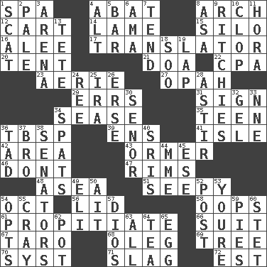 ACROSS 1. Health resort 4. Blind as ____ 8. Bowlike part 12. Draw slowly or heavily 14. Unable to walk 15. Grain storage tower 16. Toward shelter 17. Interpreter 20. Portable shelter 21. ___ good deed 22. Numbers guy (abbr.) 23. Nest on high 27. Brightly colored fish 29. Blunders 31. Signal 34. Gospel singer Marvin 35. Adolescent 36. Cook's measure (abbr.) 39. Followers of ems 41. Capri or Wight 42. Length times width 43. Channel Islands abalone 46. Do not 47. Basketball hoops 48. At sea 51. Not well drained, as in land 54. Sep. follower 56. Flaplike covering 58. I made a mistake 61. Conciliate 66. Costume for a special activity 67. Pacific island yam 68. Cassini of fashion 69. Woody plant 70. System (abbr.) 71. Volcanic refuse 72. Eastern Standard Time (abbr.) DOWN 1. Get outta here! 2. Light colored 3. Sports stadium 4. The first octave above the treble staff 5. Oblong piece of solid material 6. Nursemaid (var.) 7. Watch over 8. White ___ sheet 9. Actors Guy, Robert Welles, and Clint 10. Hoof sound 11. Israeli folk dance 13. False hair 18. "Barney Miller" actor Jack 19. Infant locale 24. Portuguese money of account (variant) 25. Lyricist Gershwin 26. Celtic language 28. Moving or stirring 30. Sir (Sp.) 32. Set 33. Compass dir. 34. Arguments over trivial matters 36. Small boy 37. Sis' sibling 38. Legislators 40. Indian titles of respect 44. Madame (abbr.) 45. Compass dir. 49. Biblical high priest 50. Small island 52. Mail 53. You are 54. Elects 55. Supercomputer manufacturer 57. "Vaya con ____" 59. Sliced desserts 60. Proofreading order 62. Cooking vessel 63. Everything 64. Afternoon social gathering 65. Ovum