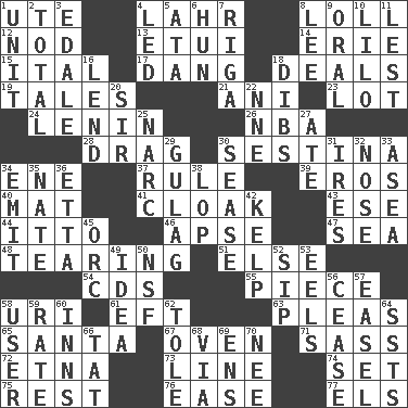 ACROSS 1. Shoshoni 4. Cowardly lion portrayer 8. Hang loosely or laxly 12. Dreamland 13. Needle holder 14. 4th largest of the Great Lakes 15. Slanted text style (abbr.) 17. Mild oath, euphamism for damn 18. Allots cards 19. Stories 21. Cuckoo 23. Car dealer's back yard 24. Soviet premier 1918-24 26. Basketball assoc. 28. To trail on the ground 30. French poetic form 34. Compass dir. 37. Court order 39. Greek god of love 40. Floor covering 41. Covering 43. Compass dir. 44. "Tell ____ the Marines!" 46. Domed church section 47. Ocean 48. Pulling apart 51. Otherwise 54. Music discs 55. Part 58. RI univ. 61. Newt 63. Entreaties 65. Before Barbara or Clara 67. Baking chamber 71. Backtalk 72. Inactive volcano in Sicily 73. Actor's bit 74. Put into a specified state 75. Take ten 76. Relaxation 77. Raised railways DOWN 1. A single undivided whole 2. "_____ Recall" 3. Peak District village in England 4. Directed 5. "One Day ___ Time" 6. Attila the _ 7. Capital of Latvia 8. Area sheltered from the wind 9. Of the mouth 10. _ and Stitch 11. For fear that 16. Grant temporary use of 18. Rights 20. Title for a knight 22. Compass dir. 25. Drug cop 27. Had dinner 29. Russian prison camp 30. Gospel singer Marvin 31. Angers 32. Sense of smell 33. At sea 34. Send forth 35. Nathan's nickname 36. Singer James 38. Trim (branches) 42. Seaweed 45. The grampus (Milton) 49. It may be bright or harebrained 50. Overdraft (abbr.) 52. Small drink 53. Snakelike fish 56. Desist 57. Artist's stand 58. One who makes use of a thing 59. Assign a rank or rating to 60. Lodging establishments 62. Lacquered or enameled metalware 64. Fast planes 66. Make lace 68. By way of 69. Followers of ems 70. Born