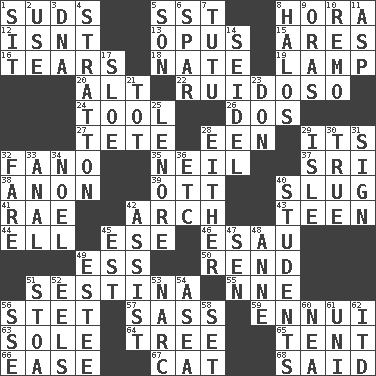 ACROSS 1. Soap bubbles 5. Fast jet (abbr.) 8. Israeli folk dance 12. Is not 13. Musical composition 15. Ancient Greek god of war 16. Pulls into pieces 18. Nathan's nickname 19. Desk light 20. The first octave above the treble staff 22. Boisterous (Brazilian Portuguese) 24. Instrument 26. Two (Sp.) 27. False hair 28. Car or cant ending 29. ___ a Wonderful Life 32. Papal veil 35. Famous astronaut Armstrong 37. _ Lanka 38. Soon (poet.) 39. Baseball player Mel 40. Snaillike creature with no shell 41. Actress Charlotte 42. Bowlike part 43. Adolescent 44. Pipe bend 45. Compass dir. 46. Son of Isaac 49. Double-curved letter 50. Tear apart 51. French poetic form 55. Compass dir. 56. Proofreading order 57. Backtalk 59. World-weariness 63. Not divided or shared with others 64. Relationship diagram 65. Portable shelter 66. Comfort 67. Feline 68. Stated DOWN 1. Be seated 2. Purpose 3. Heredity factor (abbr.) 4. Ski resort town in Vermont 5. Boy, to dad 6. Practice fight 7. Ballerina skirt 8. Saint headwear 9. Mouths or openings 10. San ____ (Riviera town) 11. Viper 14. Beer mug 17. _ gin 21. Small child 23. Spanish title 25. Poe poem 28. One or the other of two 29. Capri or Wight 30. Loyal 31. Attach a signature 32. Conductor's collection 33. Of or related to the anus 34. Christmas carol 36. And so on (abbr.) 40. SAT takers 42. Help 45. Eastern Standard Time (abbr.) 47. Elected rep. 48. Queen of England 1702-14 49. First name in cosmetics 51. Portico 52. Snakelike fish 53. Drug cop 54. At sea 56. Compass dir. 58. Arrange properly for use 60. Teachers' org. 61. University (slang) 62. It would