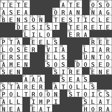 ACROSS 1. Wig 5. Had dinner 8. Bear (Spanish) 11. Toward the sea 12. Northwest Algerian city 13. Tired old horse 14. Gillaume's butler role 17. A testis 19. Cease 21. Cigar-shaped 22. _ and Stitch 23. Period 24. Parent Teacher Assoc. 27. Snakelike fish 29. To separate or throw off 32. Failure 34. By way of 36. One who doesn't tell the truth 37. Celtic language 38. Raised railways 39. To (old English) 40. So be it 41. Distress signal 42. Administered medicine 43. Elected rep. 44. Male parent of an animal 46. Compass dir. 47. Auto club (abbr.) 50. Oceans 52. A viewer who gazes fixedly 55. Ringlike coral islands and reefs 57. Characterized by complete cowardliness 59. Unemotional ones 62. 100% 63. Body of Kaffir warriors 64. Narrow board 65. Teachers' org. 66. Ingest 67. Israeli folk dance DOWN 1. Bar bill 2. Compass dir. 3. Look after 4. Artist's stand 5. "We ___ not amused" (Victoria) 6. Clothes sense 7. Keyboard key 8. Single time 9. Table seasoning 10. Double curve, resembling the letter S 12. Baseball player Mel 15. Flexible twig of a willow tree 16. "Death on the ____" 18. Retirement account (abbr.) 20. Finds the solution 24. Entreaties 25. Singer Mel 26. NE Netherlands city 28. Grain storage towers 29. Wash lightly 30. Consumed 31. Wear away 33. Car or cant ending 35. Aid 36. Nilotic language 42. Started a card game 45. Vintage cars 47. Tate display 48. Nest on high 49. Odor 51. Splash clumsily 52. Connect, as a bridge 53. Lacquered or enameled metalware 54. Silent film actress Nazimova 55. Black tropical American cuckoo 56. Grain storage tower 58. Elect 60. Auto 61. R.R. building
