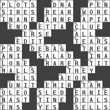 ACROSS 1. Schemes 6. Heredity factor (abbr.) 9. Writing instrument 12. Begets 13. Bring up, as a child 14. Had on 15. Empty; void 16. Queen of England 1702-14 17. Capital of Western Samoa 18. Conclusion 19. Singer James 20. A slight indication 21. Celtic language 23. 100% 24. Prepare for publication 25. Pulls into pieces 28. Writing tablet 30. Debunk (Brit. slang) 34. Long journey 35. Black tropical American cuckoo 36. Vegetable dish 38. _ tizzy (2 wds.) 39. Ear part 41. Less widely known 43. Teat (slang) 44. Shopping centers 46. Those things 48. Raised railways 49. Period of immesurable duration 50. A single undivided whole 51. Arab leader 53. Scottish cap 56. Butter sub 57. Downhill vehicle 58. Bert's buddy 60. Political cartoonist Thomas 61. Prong on a fork 62. Allots cards 63. Followers of ems 64. It is so 65. Makes a sale DOWN 1. Air pressure measure (abbr.) 2. Actor's bit 3. Northwest Algerian city 4. Looked after 5. Compass dir. 6. Gouge 7. Nanny 8. "We ___ not amused" (Victoria) 9. Teen's desire 10. One of the Great Lakes 11. Teachers' org. 13. Assign a rank or rating to 14. Place for singles 19. _____ Park, CO 20. Feline 22. To free from 24. The property of being fit to eat 26. Painter Guido (1575-1642) 27. Three-handed card game 28. Inside of hand 29. Small Philippine buffalo 31. Soap unit 32. Wing 33. Slender fish 37. Prevent from occurring 40. American author Paul (1891-1958) 42. 17th letter of the Greek alphabet 45. Fast jet (abbr.) 47. Main course 49. Assistant 50. Uhlan (variant) 51. Writer Wiesel 52. Not women's 54. Of or related to the anus 55. Place where flour is made 56. Single 57. Filthy place 58. Begley and Asner 59. Curvy letter