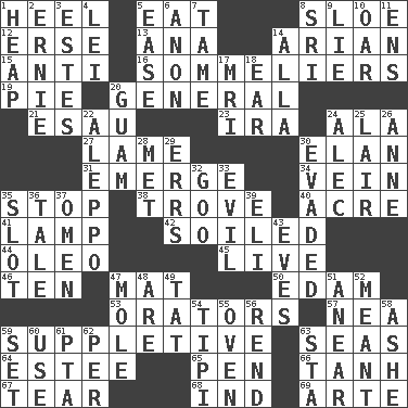 ACROSS 1. The bottom of a shoe or boot 5. Ingest 8. _ gin 12. Celtic language 13. Santa ___, CA 14. Believer in; advocate of (suffix) 15. Against 16. Wine waiters 19. Sliced dessert 20. Commissioned military rank 21. Son of Isaac 23. Retirement account (abbr.) 24. Wing 27. Unable to walk 30. Liveliness 31. Develop 34. Distinctive style or manner 35. Cease 38. Collection of objects 40. Measure of real estate 41. Desk light 42. Dirtied 44. Margarine 45. Not recorded 46. Nine, plus one 47. Floor covering 50. Dutch treat 53. Speakers 57. Teachers' org. 59. Supplementary 63. Oceans 64. First name in cosmetics 65. Writing instrument 66. Hyperbolic tangent 67. Rend 68. Indiana (abbr.) 69. Johnson of "Laugh-In" DOWN 1. Pile 2. Bert's buddy 3. _____ Park, CO 4. Luau accessory 5. Comfort 6. At once, immediately (arch.) 7. Docile 8. _ Lanka 9. Falsehood 10. Rowing implement 11. Followers of ems 14. Silent film actress Nazimova 17. Medical imaging device (abbr.) 18. Hearing organ 20. Island territory of the United States 22. City in Syria 24. Actor Baldwin 25. Den 26. Singer Murray 28. Was introduced to 29. Blunders 30. Eluded 32. Thick or sticky substance 33. Tending to cause great harm 35. Narrow, elongated depression 36. Story 37. Sign of something about to happen 39. Biblical high priest 43. Nights before holidays 47. Undercover agent 48. "We ___ not amused" (Victoria) 49. Make lace 51. Approach 52. Intended 54. Native american tent (variation) 55. Baking chamber 56. Tear apart 58. American tennis player Robert 59. Arrange properly for use 60. Purpose 61. Parent Teacher Assoc. 62. For each 63. R.R. building