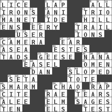 ACROSS 1. Louse (plural) 5. Pet locale 8. 100% 11. Metal shackles 13. Cuckoo 14. Musical group of three 15. French painter Edouard 16. Binary compound 17. Land elevation 18. Followers of ems 19. Suggestive of the supernatural 21. Lag or linger behind 22. One who makes use of a thing 24. Charged atoms 25. Device for capturing images 27. Ewer handle 29. Toward the sea 30. _____ Park, CO 32. Small amounts or degrees 33. Honkers 35. Nanny 39. Artist's stand 41. Presage 42. One of the 12 tribes of Israel 43. Slanted 45. Stalk of a moss capsule 48. Carry 49. Excessive but superficial compliments 50. US Secretary of Labor Elaine L. _ 52. Strike 55. Quote 56. Actress Charlotte 57. Lacerates 59. Toward shelter 60. Shade tree 61. Gurus 62. Nine, plus one 63. Raised railways 64. Trial DOWN 1. Citrus frut 2. SW Asia republic 3. Eaten 4. Compass dir. 5. Den 6. "60 Minutes" Commentator Rooney 7. Sliced dessert 8. Believer in; advocate of (suffix) 9. Ms. Damita and namesakes 10. Hang loosely or laxly 12. Bull 14. Through, poetically 20. Epoch 21. Become fatigued 23. Gospel singer Marvin 25. Feline 26. White ___ sheet 27. Curvy letter 28. Had dinner 30. Snakelike fish 31. Snob 33. Girls' org. (abbr.) 34. Car or cant ending 36. Electrical Measurement 37. Born 38. Plus 40. First of billions? 43. R.R. building 44. Plunders 45. Grin 46. Ingested 47. Family _ (genealogy) 49. Get outta here! 50. Give a ring to 51. Folds over and sews together 53. Ancient Greek god of war 54. Inconspicuous attention getter 56. Portuguese money of account (variant) 58. Ingest