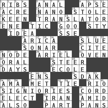 ACROSS 1. Chest bones 5. Of or related to the anus 9. Domed church section 13. Measure of real estate 14. Billionth: prefix 15. Took without asking 16. Peachy ____! 17. Interpreter 19. Compass dir. 20. Nervous spasm 21. Thick or sticky substance 22. Filthy place 23. The content of cognition 25. Compass dir. 26. N. Chile seaport 30. Change direction abruptly 34. Echolocation 35. Quote 36. Thickened enlargement 39. Satellite of Uranus 42. Baking chamber 43. Relating to the mouth 44. Navigate 46. 24-hour periods 47. Learning spot: Fr. 48. Followers of ems 51. Neighbor of Neb. 54. Housemaid (var.) 57. Was introduced to 58. Neckwear 60. _ de Janeiro 62. Seigniories (variant) 65. Drawstring 66. Voters do this 67. SW Asia republic 68. Among 69. In addition 70. Component 71. Zero-star reviews DOWN 1. Libertine 2. Ancient Celtic tribe of eastern Britain 3. A special lineage 4. Elected rep. 5. Against 6. Drug cop 7. Santa ___, CA 8. Yearns 9. _ moment's notice (2 wds.) 10. Cooking vessels 11. Narrow opening 12. Suggestive of the supernatural 15. A type of plum 18. Mayday 20. Edible starchy tuberous root 24. Artist's stands 27. _ tizzy (2 wds.) 28. Automobile 29. Ascend 30. Tallied 31. 54 in ancient Rome 32. Shoshoni 33. Car or cant ending 36. Allow head to fall sleepily 37. Mouth or opening 38. 24 hours 40. And so on (abbr.) 41. Lion 45. Otherwise 48. Give off 49. Modern: prefix 50. Long narrow piece of something 52. Odor 53. Japanese brewing company 54. Toward the sea 55. Place where flour is made 56. Ripens 58. Rend 59. Is not 61. Probability 63. Non-commissioned officer (abbr.) 64. Lyricist Gershwin 65. Head covering