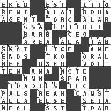 ACROSS 1. Made supply last 5. Eastern Standard Time (abbr.) 8. "Tell ____ the Marines!" 12. Painter Guido (1575-1642) 13. Jai _ 15. Capital of the state of Qatar 16. Rep 18. Torque (variant) 19. Having or resembling wings 20. Girls' org. (abbr.) 22. Curse 24. Sharp remark 26. Corporate head (abbr.) 27. Length times width 28. Wing 29. Bar bill 32. Three-handed card game 35. Louse (plural) 37. A saturated hydrocarbon 38. Conclusions 39. Ring climax 40. Taken by mouth 41. Born 42. One who uses or employs something 43. Electrical Unit 44. "___ Little Indians" 45. Santa ___, CA 46. Observe 49. Compass dir. 50. Coast Guard woman 51. Sycophants 55. Affectionate concern, for short 56. Friends 57. 480, 500 or 516 sheets of paper 59. 2nd pers. sing. pres. of can (arch.) 63. Silent film actress Nazimova 64. Otherwise 65. Stalk of a moss capsule 66. Anneal 67. Fast jet (abbr.) 68. Frog relative DOWN 1. Period 2. Barrel 3. Compass dir. 4. Empty-headed or silly people 5. Erode 6. _ gin 7. Canvas cover 8. Potato state 9. Lacquered or enameled metalware 10. Not this but _ 11. Rowing implement 14. Ice on the eave 17. Russian ruler of old 21. "We ___ not amused" (Victoria) 23. Beverage made from leaves 25. Greek mezzo-soprano Agnes 28. Oak nuts 29. Pacific island yam 30. Of or related to the anus 31. Waist strap 32. Emitted 33. Leg joint 34. An important port of Yemen 36. Mamie's mate 40. Cloudy 42. Undo the wiring of 45. Also 47. Choose 48. Baby powder 49. Relating to the nose 51. Lie 52. Spanish pot 53. Snakelike fish 54. Backtalk 56. Baking dish 58. Was introduced to 60. Modern: prefix 61. R.R. building 62. Bit