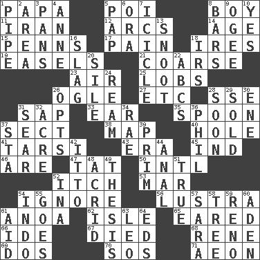 ACROSS 1. Dad 5. Luau course 8. Male child 11. SW Asia republic 12. Arches 14. Grow older 15. Actor Sean's family 17. Ache 18. Angers 19. Artist's stands 21. Rough 23. Wind 25. Tennis shots 26. Stare 27. And so on (abbr.) 28. Compass dir. 31. Plant excrement 33. Hearing organ 35. Soup utensil 37. Religious group 38. Atlas unit 40. Hollow 41. Tarsus (plural) 43. Epoch 45. Indiana (abbr.) 46. "We ___ not amused" (Victoria) 47. Make lace 50. International (abbr.) 52. Hankering 53. Make imperfect 54. Fail to notice 56. A period of five years 61. Small Philippine buffalo 62. Small island 65. Having ears or earlike features 66. Binary compound 67. Passed on 68. French philosopher Descartes 69. Two (Sp.) 70. Distress signal 71. Period of immesurable duration DOWN 1. Corncob 2. Type of rug 3. Zero-star reviews 4. Singer Murray 5. Infant food 6. Mouth or opening 7. Ice on the eave 8. Oblong pieces of solid material 9. Double curve, resembling the letter S 10. Affirmative reply 13. Snob 16. Volcanic refuse 18. Big collection agency 20. Drop; flow; fall 22. Lettered men learn these first 24. 480, 500 or 516 sheets of paper 26. Elects 28. Within a short period 29. Exchanged or delivered for money 30. Compass dir. 31. Shrivel 32. Land measure 34. Actress Charlotte 36. Silvers or Donahue 37. R.R. building 39. Demure 42. "Tell ____ the Marines!" 44. Of or related to the anus 48. Sour-tasting 49. College paper 51. Loyal 52. _ tizzy (2 wds.) 54. _ china 55. Moves 57. "Two Mules for Sister ____" 58. Relationship diagram 59. Former U.S. Attorney General Janet 60. An important port of Yemen 61. Assist 63. Lion 64. Begley and Asner