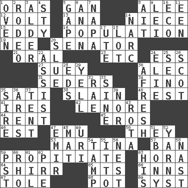 ACROSS 1. Mouths or openings 5. Separate the seeds from cotton 8. Toward shelter 12. Electrical Unit 13. Santa ___, CA 14. Sibling's daughter 15. Whirlpool 16. Census information 19. Born 20. Legislator 21. Spoken 23. And so on (abbr.) 24. Curvy letter 27. Chop _ 30. Actor Baldwin 31. Spring feasts 34. Fine (Spanish) 35. Suttee (variant) 38. Killed 40. Take ten 41. Angers 42. Poe poem 44. Monthly bill 45. Greek god of love 46. Eastern Standard Time (abbr.) 47. Australian flightless bird 50. Those people 53. Chrissie's court nemesis 57. Prohibit 59. Conciliate 63. Israeli folk dance 64. Bake eggs in their shells 65. Mountains (abbr.) 66. Restaurants 67. Lacquered or enameled metalware 68. Cooking vessel 69. System (abbr.) DOWN 1. Baking chamber 2. Cowboy competition 3. Tree or shrub in the Birch family 4. Filthy place 5. Yawn 6. Soon (poet.) 7. California wine valley 8. Small island 9. Luau accessory 10. Environmental prefix 11. Car or cant ending 14. Drug cop 17. Shoshoni 18. Car dealer's back yard 20. Change direction abruptly 22. Aid 24. Writer Wiesel 25. Elected reps. 26. Highlander 28. Begley and Asner 29. Shout 30. Anew 32. Actress Charlotte 33. Trig term 35. The founder of a family 36. Ancient Greek god of war 37. Portable shelter 39. Not either 43. Round or rotation of duties 47. Arab leader 48. Floor protector 49. RI univ. 51. Dark wood 52. Tall tales 54. Pack (down) 55. "Tell ____ the Marines!" 56. Egg locale 58. Political cartoonist Thomas 59. Pacific Standard Time (abbr.) 60. 17th letter of the Greek alphabet 61. Lubricate 62. Before (prefix) 63. Part of HMS, perhaps