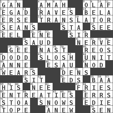 ACROSS 1. Separate the seeds from cotton 4. Wet nurse 8. Norwegian king 12. Mild oath 14. All-night dance parties 16. Actor Lugosi 17. Celtic language 18. Interpreter 20. Actors Connery and Penn 22. R.R. building 23. Observe 24. Snakelike fish 25. Compass dir. 28. Title for a knight 30. Saudi Arabian king (1953-1964) 31. Effrontery 35. Unit of force equal to gravity 37. Political cartoonist Thomas 40. Vintage cars 41. Texas town _ City 42. Splash clumsily 44. A single undivided whole 45. Queen of England 1702-14 46. He sold his birthright 47. Allow head to fall sleepily 48. Puts on (as clothing) 50. Cub Scout units 52. Be seated 54. Begley and Asner 55. Sound made by sheep 58. Part of HMS, perhaps 61. Born 63. Strips of potato fried in deep fat 65. Pleas 70. Blunders 71. Portico 72. Overwhelms 73. Singer Brickell 74. Drink excessively 75. Afresh 76. Elected rep. DOWN 1. Honkers 2. Match 3. Relating to the nose 4. Tate display 5. Spoil 6. Actress Gardner 7. Coop moms 8. Chief or king in Benin or Nigeria 9. Allows 10. Medicinal plant 11. Conductor's collection 13. Lair 15. Fast planes 19. (Had) reclined 21. Ocean 26. Religious women 27. Peak District village in England 29. Summer TV shows 30. Spring feasts 32. Western Nevada city 33. Nothingness 34. Eastern Standard Time (abbr.) 35. Went 36. Pulitzer Prize-winning author Ferber 38. Distress signal 39. Sadhe (variant) 41. Obsolete 43. Became colored 49. Trig term 51. Science/research agcy. 53. Beverages made from leaves 55. Avian creatures 56. Nest on high 57. NE Netherlands city 58. Command 59. To the inside or interior of 60. Halt 62. Inactive volcano in Sicily 64. To riddle 66. Actress Charlotte 67. Electrically charged atom 68. She-sheep 69. Compass dir.