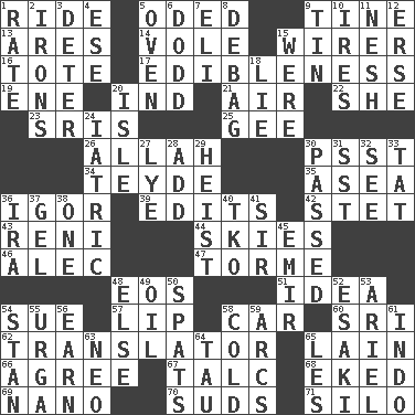ACROSS 1. Travel on or in a vehicle 5. Wrote a lyric poem 9. Prong on a fork 13. Ancient Greek god of war 14. Short-tailed, large-bodied rat 15. One who wires 16. Lug 17. The property of being fit to eat 19. Compass dir. 20. Working for oneself (abbr.) 21. Wind 22. A female animal or person 23. Indian titles of respect 25. Unit of force equal to gravity 26. Assad's deity 30. Inconspicuous attention getter 34. Miss Universe 1986, Barbara Palacios _ 35. Toward the sea 36. Composer Stravinsky 39. Proofreads 42. Proofreading order 43. Painter Guido (1575-1642) 44. Atmospheres 46. Actor Baldwin 47. Singer Mel 48. Greek goddess of the dawn 51. The content of cognition 54. Take to court 57. Mouth edge 58. Automobile 60. Indian title of respect (Mr.) 62. Interpreter 65. (Had) reclined 66. Match 67. Baby powder 68. Supplemented with great effort 69. Billionth: prefix 70. Soap bubbles 71. Grain storage tower DOWN 1. Pace 2. Metal shackles 3. Prevent from occurring 4. Compass dir. 5. Baking chamber 6. Texas town _ City 7. Biblical high priest 8. Debunk (Brit. slang) 9. Shallow baking pan 10. Angers 11. Tender 12. Celtic language 15. Past tense of be (plural) 18. Whopper 20. Capri or Wight 24. Of or pertaining to medicine 27. Sodium hydroxide 28. Say or write further 29. Robbery 30. Went by 31. Fast jet (abbr.) 32. Observe 33. Make lace 36. Lyricist Gershwin 37. Set 38. Single 40. Ring climax 41. Title for a knight 45. Independent ruler or chieftain 48. Otherwise 49. Lubricate 50. Arguments over trivial matters 52. 1973 Nobel Price Winner (Physics) Leo 53. Satellite of Uranus 54. Comedian Laurel of Laurel & Hardy 55. Capital and largest city of Mongolia 56. Merit 58. Chilled 59. Arches 61. _ china 63. Modern: prefix 64. The 19th letter of the Greek alphabet 65. French article