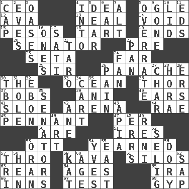 ACROSS 1. Corporate head (abbr.) 4. It may be bright or harebrained 8. Stare at amorously 12. Actress Gardner 13. Be tempered by heat 14. Lacking any legal or binding force 15. Mexican monetary units 18. Small pie 19. Conclusions 20. Elected representative 22. Before (prefix) 23. Stalk of a moss capsule 24. Distant 25. Title for a knight 26. Flamboyance 30. Definite Article 33. Sea 36. Son of Odin 37. Moves up and down 39. Black tropical American cuckoo 40. Hearing organs 41. _ gin 42. Sports stadium 44. Actress Charlotte 45. Pre-World Series prize 47. For each 50. "We ___ not amused" (Victoria) 51. Angers 53. Baseball player Mel 54. Had a strong desire 57. Through, poetically 59. Polynesian shrub of the pepper family 61. Grain storage towers 63. Hitchcock's "____ Window" 64. Eons 65. Retirement account (abbr.) 66. Taverns 67. Trial 68. Hustle DOWN 1. Head covering 2. Nights before holidays 3. Fertile tracts in a desert 4. To the inside or interior of 5. Letter starter 6. Ewer handle 7. Keyboard modifier key 8. Make much ado about nothing 9. Went 10. Hat (slang) 11. Begley and Asner 16. Washington bills 17. Suttee (variant) 21. Pacific island yam 22. Baking dish 24. Avid follower 26. Ache 27. Burn to charcoal 28. Israeli folk dance 29. Celtic language 30. Cook's measure (abbr.) 31. Opening into or through something 32. Inky black, to poets 34. Draw slowly or heavily 35. Compass dir. 38. Legislators 42. A saturated hydrocarbon 43. Capital of Western Samoa 46. Tate display 48. Blunders 49. Painter Guido (1575-1642) 52. Former Milwaukee Brewers owner Bud 53. Northwest Algerian city 54. Jacques Cousteau's middle name 55. 90 degrees 56. Small, narrow, flatbottom fishing boat 57. Three (prefix) 58. Layer 59. Krazy ___ of comics 60. Grow older 62. Plant excrement