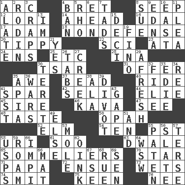 ACROSS 1. Curve 4. Cy Young winner Saberhagen 8. Ooze 12. Australian parrot (variant) 14. Forward in time 16. Freehold land 17. First man 18. Unrelated to defense, as in spending 20. Likely to tip or tilt 22. _-fi 23. "One Day ___ Time" 24. Followers of ems 25. And so on (abbr.) 28. _ tizzy (2 wds.) 30. Russian ruler of old 31. Auction bid 35. Deep reverence 37. Necklace unit 40. Travel on an animal 41. Practice fight 42. Former Milwaukee Brewers owner Bud 44. Writer Wiesel 45. The founder of a family 46. Polynesian shrub of the pepper family 47. Perceive with the eye 48. Clothes sense 50. Brightly colored fish 52. Shade tree 54. Nine, plus one 55. Pacific Standard Time (abbr.) 58. RI univ. 61. "Barney Miller" actor Jack 63. A sleeping potion; an opiate (poet.) 65. Wine waiters 70. Play the lead 71. Dad 72. Take place subsequently 73. Soaks 74. Stricken, poetically 75. Peachy ____! 76. Born DOWN 1. Having winglike extensions 2. "The Thinker" sculptor 3. Dice game 4. Prohibit 5. 17th letter of the Greek alphabet 6. Car or cant ending 7. Small amounts or degrees 8. Institute legal proceedings 9. Pulitzer Prize-winning author Ferber 10. 90 degrees 11. Entreaty 13. Naughty child 15. Tenth: prefix 19. A pale, very dry sherry 21. It is so 26. Bar bills 27. Small stream 29. Anew 30. Cylindrical with tapered ends 32. Do some clerical work 33. Singer Brickell 34. To sift 35. Capital of Western Samoa 36. Armed conflicts 38. Wing 39. A piece of turf (Scot.) 41. Fast jet (abbr.) 43. Yawn 49. Otherwise 51. Plus 53. Undercover agent 55. Eucharist need 56. Schedule 57. Laconic 58. United States Postal Service (abbr.) 59. Wander 60. Body of Kaffir warriors 62. Pig sound 64. Compass dir. 66. Floor covering 67. Compass dir. 68. Sorrow 69. Elected rep.