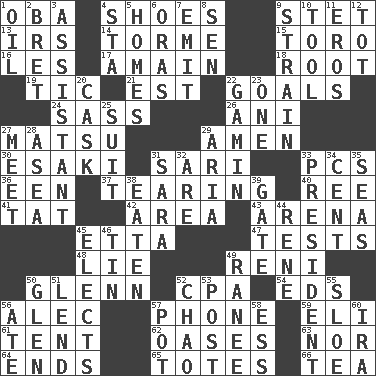 ACROSS 1. Chief or king in Benin or Nigeria 4. Imelda's hoard 9. Proofreading order 13. Big collection agency 14. Singer Mel 15. "Corrida" creature 16. French article 17. With great haste 18. Carrot, for example 19. Nervous spasm 21. Eastern Standard Time (abbr.) 22. Purposes of endeavors 24. Backtalk 26. Cuckoo 27. Taiwanese island in East China Sea 29. So be it 30. 1973 Nobel Price Winner (Physics) Leo 31. Indian skirt 33. Personal Computers (abbr.) 36. Car or cant ending 37. Rending 40. Portuguese money of account (variant) 41. Make lace 42. Length times width 43. Sports stadium 45. Singer James 47. Trials 48. Falsehood 49. Painter Guido (1575-1642) 50. American astronaut and politician John 52. Numbers guy (abbr.) 54. Begley and Asner 56. Actor Baldwin 57. Give a jingle 59. Biblical high priest 61. Portable shelter 62. Fertile tracts in a desert 63. And not 64. Extremities 65. Lugs 66. Afternoon social gathering DOWN 1. Petroleum 2. Cy Young winner Saberhagen 3. Aide 4. R.R. building 5. Dwellings 6. Mouths or openings 7. Send forth 8. Elected rep. 9. Put through a sieve 10. Utensil 11. Greek god of love 12. Small child 20. Keg 22. Homeless child 23. Single 25. Costume for a special activity 27. Confront 28. At sea 29. Roberta Peters solo 31. "Two Mules for Sister ____" 32. "We ___ not amused" (Victoria) 33. Elected leader of a country 34. Penny 35. Oceans 38. Ingested 39. Yard entry 44. French philosopher Descartes 45. Chooses 46. Shallow baking pan 49. Indian princess (variant) 50. Small, secluded valley 51. Grant temporary use of 52. US Secretary of Labor Elaine L. _ 53. Mail 55. A type of plum 56. Had dinner 57. Plant holder 58. Curvy letter 60. Lyricist Gershwin