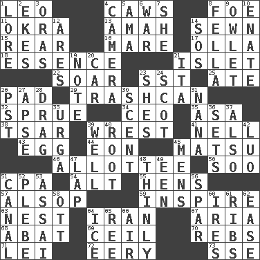 ACROSS 1. Lion 4. Crow sounds 8. Enemy 11. Gumbo ingredient 13. Wet nurse 14. Stitched 15. Stern 16. Female horse 17. Water jar 18. Substance 21. Small island 22. Fly high 23. Fast jet (abbr.) 25. Had dinner 26. Writing tablet 29. File 13 32. Disorder 34. Corporate head (abbr.) 35. White ___ sheet 38. Russian ruler of old 39. Take or capture by force 41. 1994 drama film starring Jodie Foster 43. Oval reproductive body of a fowl 44. A really long time 45. Taiwanese island in East China Sea 46. One to whom something is allotted 50. "Barney Miller" actor Jack 51. Tax preparer (abbr.) 54. Keyboard modifier key 55. Coop moms 57. Columnist Joseph or Stewart 59. Heighten or intensify 63. A home for chicks 64. SW Asia republic 67. Roberta Peters solo 68. Blind as ____ 69. To provide with a ceiling 70. Confederate soldiers (slang) 71. Flowery wreath 72. Suggestive of the supernatural 73. Compass dir. DOWN 1. Old wives' tales, e.g. 2. Makes supply last 3. Mouths or openings 4. Device for capturing images 5. Nursemaid (var.) 6. Armed conflict 7. A female animal or person 8. Chap (slang) 9. A small or young owl 10. Related on the mother's side 12. Ancient Greek god of war 14. Distress signal 19. Musical sound 20. Automobile 21. Call ___ day 23. "______ My Girl" (Turtles hit) 24. Native of Scotland 26. Pacific Standard Time (abbr.) 27. Domed church section 28. To draw with force 30. Odor 31. Grandmother 33. Capital and largest city of Mongolia 36. Puts into a specified state 37. In addition 39. Water source 40. Carrot, for example 42. Nilotic language 45. Not women's 47. Infant locale 48. Without viscosity 49. Car or cant ending 51. Lessep's creation 52. Military trainee 53. Slender Brazilian palm 56. Practice fight 58. Baseball player Mel 60. Angers 61. Teases 62. Relaxation 64. Frozen water 65. Portuguese money of account (variant) 66. Atmosphere