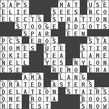 ACROSS 1. Plant excrements 5. Floor protector 8. Purpose 11. Writer Wiesel 12. Perceives with the eye 13. Non-commissioned officer (abbr.) 14. Opts 17. Ski resort town in Vermont 19. Moe Howard, for one 21. Foolish or stupid persons 22. Practice fight 23. Car or cant ending 24. Personal Computers (abbr.) 27. Greek god of love 29. R.R. building 32. Dwellings 34. Shoshoni 36. Use a swizzle stick 37. Migrant worker of the '30s 38. Beverage made from leaves 39. Unable to walk 40. 1994 drama film starring Jodie Foster 41. It is so 42. Thermoplastic polyamide 43. Compass dir. 44. San ____ (Riviera town) 46. Epoch 47. Nanny (var.) 50. Austrian-born American filmmaker Fritz 52. Spoke pompously 55. Michaelmas daisies 57. Accusation by an informer 59. Flight of steps 62. Single 63. Roll call or roster of names 64. Scornful sounds 65. To sift 66. Eastern Standard Time (abbr.) 67. Overwhelm DOWN 1. Observe 2. 100% 3. Sliced desserts 4. Religious groups 5. Was introduced to 6. Nest on high 7. Sadhe (variant) 8. To (old English) 9. Native of Scotland 10. Immeasurably long periods of time 12. Compass dir. 15. Drinks excessively 16. Fly high 18. Shallow baking pan 20. Cross 24. Give a jingle 25. Popular sodas 26. Grin 28. Guide 29. Lacking originality or spontaneity 30. Southeast Indonesia island 31. Sports stadium 33. Snakelike fish 35. Artist's stands 36. Mischievous 42. Music written for nine 45. Floor coverings 47. "One Day ___ Time" 48. Distance measurement (Brit.) 49. Goodbye (Sp.) 51. Takes hold of 52. Aroma 53. French philosopher Descartes 54. Toward shelter 55. Santa ___, CA 56. The Jewish people; Israel 58. Baseball player Mel 60. Friend of Pooh 61. Compass dir.