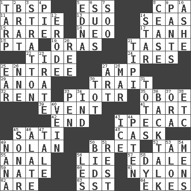 ACROSS 1. Cook's measure (abbr.) 5. Double-curved letter 8. Numbers guy (abbr.) 11. Nick name for Arthur 13. Superhero pair 14. Oceans 15. More valued for its uncommonness 16. Modern: prefix 17. Hyperbolic tangent 18. Parent Teacher Assoc. 19. Mouths or openings 21. Clothes sense 22. Periodic rise and fall of the sea level 24. Angers 25. Main course 27. Electrical Unit 29. Small Philippine buffalo 30. Distinguishing feature 32. Monthly bill 33. Peter (Polish) 35. Mitch Miller's instrument 39. Happening 41. Small pie 42. Conclude 43. Medicinal drug used to evoke vomiting 45. Suttee (variant) 48. Keg 49. Pitcher Ryan 50. Cy Young winner Saberhagen 52. Scottish cap 55. Of or related to the anus 56. Untruth 57. Peak District village in England 59. Nathan's nickname 60. Begley and Asner 61. Thermoplastic polyamide 62. "We ___ not amused" (Victoria) 63. Fast jet (abbr.) 64. Makes supply last DOWN 1. Canvas cover 2. Naughty child 3. Ski resort town in Vermont 4. Sliced dessert 5. Pulitzer Prize-winning author Ferber 6. Institutes legal proceedings 7. "Barney Miller" actor Jack 8. Desist 9. Leg coverings 10. American tennis player Robert 12. Eat (away) 14. Play the lead 20. To riddle 21. Native american tent (variation) 23. Feeling or showing extreme anger 25. Hearing organ 26. Compass dir. 27. Tate display 28. Make imperfect 30. Small child 31. Lugs 33. Animal enclosure 34. Indiana (abbr.) 36. Sass 37. Mouth or opening 38. And so on (abbr.) 40. Distinctive style or manner 43. Frozen water 44. Eucharist need 45. Echolocation 46. Having winglike extensions 47. Lie 49. Nanny 50. Auction offers 51. Repose 53. Medicinal plant 54. Not women's 56. French article 58. Color