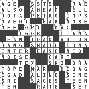 ACROSS 1. Personal question 4. Fast planes 8. Actress Charlotte 11. In addition 13. Forward in time 15. Pipe bend 16. Roll call or roster of names 17. Stone: prefix 18. Naughty children 19. Unconcealed 21. Ewer handle 22. Olfactory organ 23. Born 24. Elect 27. Big _ 29. Russian composer Stravinsky 30. Woody, climbing, usually tropical plant 34. Avid follower 36. Frog relative 39. Goodbye (Sp.) 40. Mild oath, euphamism for damn 41. Slow-paced one 43. Pulitzer Prize-winning author Ferber 44. Keyboard key 46. Comfort 47. Modern: prefix 48. Annoying sound 49. Heavy open wagon 51. John Ritter's dad 53. What Jean-Claude Killy likes to do 54. Mouth or opening 57. Drink excessively 60. Make imperfect 63. Debunk (Brit. slang) 65. Mild oath 66. Place in a line 69. Trig term 70. _ Lanka 71. Gurus 72. Adolescent 73. Nine, plus one 74. Assign a rank or rating to 75. Arrange properly for use DOWN 1. Composer Copland 2. Michael Jackson trademark 3. First name in cosmetics 4. Plant excrement 5. A female animal or person 6. Wig 7. "Two Mules for Sister ____" 8. San ____ (Riviera town) 9. High mountains 10. Otherwise 12. Rowing implement 14. Dormintory (informal) 18. Happening 20. Coat; cloak 25. Cooking vessels 26. Marketplace scale 28. Insect wing 29. Swallowed 31. Assistant 32. Words to Nanette 33. White ___ sheet 34. Papal veil 35. Opposed to 37. Auto club (abbr.) 38. Plates 40. Lair 42. Path through which fluid escapes 45. To riddle 50. To free from 52. Dec. holiday 54. Off-Broadway awards 55. Indian princess (variant) 56. Rep 57. Trial 58. Legendary monster 59. Ache 61. Having or resembling wings 62. Capital of Latvia 64. Eastern Standard Time (abbr.) 67. Remaining after all deductions 68. Compass dir.
