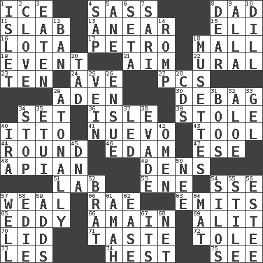 ACROSS 1. Frozen water 4. Backtalk 8. June honoree 11. Thick slice 13. Approach 15. Connecticut Ivy Leaguer 16. Globular water bottle used in Asia 17. Stone: prefix 18. Shopping center 19. Happening 21. Direct toward a target or goal 22. Mountain range 23. Nine, plus one 24. "___ Maria" 27. Personal Computers (abbr.) 29. An important port of Yemen 30. Debunk (Brit. slang) 34. Put into a specified state 36. Capri or Wight 39. Fur scarf 40. "Tell ____ the Marines!" 41. New (sp.) 43. Utensil 44. Having a circular shape 46. Dutch treat 47. Compass dir. 48. Bee-related 49. Hiding places for outlaws 51. Experiment locale 53. Compass dir. 54. Compass dir. 57. Welt 60. Actress Charlotte 63. Gives off 65. Whirlpool 66. With great haste 69. Came down and settled, as after flight 70. Flaplike covering 71. Clothes sense 72. Lacquered or enameled metalware 73. French article 74. Behest 75. Perceive with the eye DOWN 1. Small island 2. Garlic unit 3. Consumed 4. Plant excrement 5. A saturated hydrocarbon 6. Stalk of a moss capsule 7. Indian skirt 8. Letter starter 9. Silent film actress Nazimova 10. Deli pickle 12. Bar 14. Frolic 18. French bagpipes 20. Small amount or degree 25. Distinctive style or manner 26. Take place subsequently 28. Music discs 29. Lacking a tonal center or key 31. Scornful sounds 32. _ vera 33. Set 34. Close up, plug up 35. Needle holder 37. Directed 38. Elude 40. Lyricist Gershwin 42. Sign of things to come 45. Heredity factor (abbr.) 50. Born 52. Naughty child 54. Grain storage towers 55. Vertical member of a panel or frame 56. First name in cosmetics 57. Not ill 58. Singer Brickell 59. Does sums 61. Wet nurse 62. Comfort 64. Floor protector 67. It is 68. Remaining after all deductions