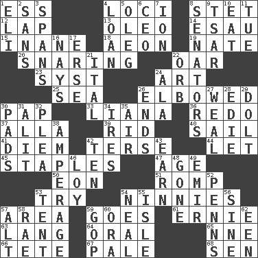 ACROSS 1. Curvy letter 4. Event scenes 8. Proofreading order 12. Infant locale 13. Butter sub 14. He sold his birthright 15. Silly 18. A really long time 19. Nathan's nickname 20. Catching in a trap 22. Rowing implement 23. System (abbr.) 24. Tate display 25. Ocean 26. Shoved, as through a crowd 30. Infant food 33. Climbing, woody, usually tropical vines 36. Do over again 37. Silent film actress Nazimova 39. To free from 40. Move on water 41. South Vietnam president (1954) 42. Laconic 44. Allow 45. Paper fasteners 47. Mature 50. A really long time 51. Frolic 53. Attempt to accomplish something 54. Fools 57. Type of rug 59. Leaves 61. Bert's buddy 63. Long (Scottish) 64. Of the mouth 65. Compass dir. 66. Wig 67. Diluted with white 68. Elected rep. DOWN 1. Connecticut Ivy Leaguer 2. Without 3. Connects, as a bridge 4. Grant temporary use of 5. Cassini of fashion 6. Corporate head (abbr.) 7. Electrically charged atom 8. Legislators 9. Russian ruler of old 10. Erode 11. Third day of the wk. 16. Negative votes 17. Celtic language 21. Slanted text style (abbr.) 22. Globe 24. In the manner of 26. Extremities 27. Welt 28. Singer Brickell 29. Dunce 30. Groovy apts. 31. Set down 32. Entreaty 34. Angers 35. Wind 38. Electrical Measurement 42. Nine, plus one 43. Merit 46. Myrna of the movies 48. Went 49. Arab leader 52. Actor Sean's family 53. Portable shelter 54. Be tempered by heat 55. Small island 56. Trig term 57. Keyboard modifier key 58. Actress Charlotte 59. Republican Party 60. Mouth or opening 62. Car or cant ending