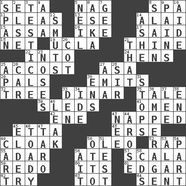 ACROSS 1. Stalk of a moss capsule 5. Tired old horse 8. Health resort 11. Entreaties 13. Compass dir. 14. Jai ____ 15. Indian state 16. Mamie's husband 17. Stated 18. Fish or hair follower 19. Southern CA. univ. 21. One or ones belonging to thee 22. To the inside or interior of 24. Coop moms 25. Buttonhole 27. White ___ sheet 29. Friends 30. Sends forth 32. Relationship diagram 33. Middle Eastern gold or silver currency 35. Falsehood 39. Bobsleighs 41. Sign of things to come 42. Compass dir. 43. Slept 45. Singer James 48. Celtic language 49. Anything that covers or conceals 50. Butter sub 52. Hit sharply and swiftly 55. The sixth month of the Jewish calendar 56. Had dinner 57. Any of the three canals of the cochlea 59. Redecorate 60. ___ a Wonderful Life 61. _ Allan Poe 62. Attempt to accomplish something 63. Small child 64. Transmitted DOWN 1. Connect, as a bridge 2. Otherwise 3. One of the two male reproductive glands 4. Auto club (abbr.) 5. Famous astronaut Armstrong 6. "____ silly question..." 7. Turn to the right 8. Killed 9. Aches 10. Assistant 12. Obscenities 14. American tennis player Robert 20. Small bed 21. Not this but _ 23. Olfactory organs 25. Fitting 26. Automobile 27. Wet nurse (var.) 28. Title for a knight 30. Followers of ems 31. Ceases 33. Lair 34. Binary compound 36. Electrical Measurement 37. Area sheltered from the wind 38. Conclusion 40. Path through which fluid escapes 43. Born 44. Came up 45. A person who is older than you are 46. Sycophant 47. Edible starchy tuberous root 49. Heavy open wagon 50. "Beetle Bailey" pooch 51. For fear that 53. ____ Jay Lerner 54. Piece 56. Small island 58. Music discs