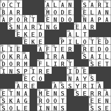 ACROSS 1. Sep. follower 4. ____ Jay Lerner 8. Indian skirt 12. Drinking establishment 13. Method 14. Liveliness 15. To the left, to Queeg 18. Inside; within (prefix) 19. California wine valley 20. Catching in a trap 22. Ewer handle 23. Supplemented with great effort 24. Keyboard modifier key 25. Supplement with great effort 26. Manned the helm 30. Whopper 33. Following 36. Make new 37. Gumbo ingredient 39. Lyricist Gershwin 40. Travel by water 41. Dormintory (informal) 42. Seductive woman who exploits men 44. Arrange properly for use 45. Heighten or intensify 47. Binary compound 50. Environmental prefix 51. Negative votes 53. "We ___ not amused" (Victoria) 54. Nineveh was its capital 57. Inactive volcano in Sicily 59. Not women's 61. Father Junipero _ 63. Heroin 64. Carrot, for example 65. Car or cant ending 66. Flatfish 67. Taverns 68. Compass dir. DOWN 1. Chief or king in Benin or Nigeria 2. Balmoral and tarboosh 3. Marketplace scale 4. So be it 5. Protracted 6. Say or write further 7. Modern: prefix 8. Legislators 9. Having or resembling wings 10. Strike 11. _ tizzy (2 wds.) 16. Immoral or dissolute person 17. Long journey 21. The content of cognition 22. Pipe bend 24. Atmosphere 26. Lightbulb-shaped fruit 27. Afternoon social gatherings 28. Singer Brickell 29. Stupid person 30. Farming town in central California 31. Image 32. Blunders 34. Do some clerical work 35. Three (prefix) 38. Electrical Measurement 42. From 43. Metal containers 46. Frozen water 48. 24-hour periods 49. Jane of fiction 52. Male parents of animals 53. Of or related to the anus 54. At once, immediately (arch.) 55. Fast planes 56. Ancient Greek god of war 57. Double-curved letter 58. Ring climax 59. Medical imaging device (abbr.) 60. Period of immesurable duration 62. One (Scot)