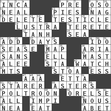 ACROSS 1. South American Indian 5. Before (prefix) 8. Bear (Spanish) 11. Actress Patricia 12. Sliced desserts 13. Tired old horse 14. Keyboard key 17. One of the two male reproductive glands 19. A period of five years 21. Cylindrical with tapered ends 22. Hyperbolic tangent 23. Ocean 24. Say or write further 27. 24-hour periods 29. Wedding promise 32. Gospel singer Marvin 34. Atlas unit 36. Operatic vocal solo 37. Without 38. Pipe bend 39. Vertical spar for supporting sails 40. Toward shelter 41. R.R. building 42. Observe 43. Mountains (abbr.) 44. Portico 46. Double-curved letter 47. American Automobile Association (abbr.) 50. Singer James 52. A viewer who gazes fixedly 55. Michaelmas daisies 57. Characterized by complete cowardliness 59. Threatening words 62. 100% 63. Body of Kaffir warriors 64. Common sense 65. Teachers' org. 66. Ingest 67. Collude with DOWN 1. Working for oneself (abbr.) 2. Born 3. Give a ring to 4. Native American of Southwest Alaska 5. Sliced dessert 6. Musical pauses 7. First name in cosmetics 8. At one time in the past 9. Table seasoning 10. Double curve, resembling the letter S 12. Parent Teacher Association (abbr.) 15. Sadhe (variant) 16. Inactive volcano in Sicily 18. Lyricist Gershwin 20. Poems 24. Indian state 25. Started a card game 26. Natives or inhabitants of Denmark 28. Table seasonings 29. Feeling or showing extreme anger 30. Flat circles 31. Profane or obscene expressions 33. Compass dir. 35. Food holders 36. Housemaid (var.) 42. Wetness 45. "Beetle Bailey" pooch 47. Nonscientific branch of learning 48. Nest on high 49. Scent 51. Sports stadium 52. Connect, as a bridge 53. Lacquered or enameled metalware 54. Silent film actress Nazimova 55. Cuckoo 56. Messy guy 58. Elect 60. Take to court 61. Eastern Standard Time (abbr.)
